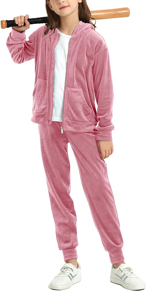 MessBebe طقم بدلات رياضية للفتيات للركض بدلة رياضية قطيفة مكونة من قطعتين ملابس بسحاب وقلنسوة طقم ملابس رياضية 110-150 in Kuwait