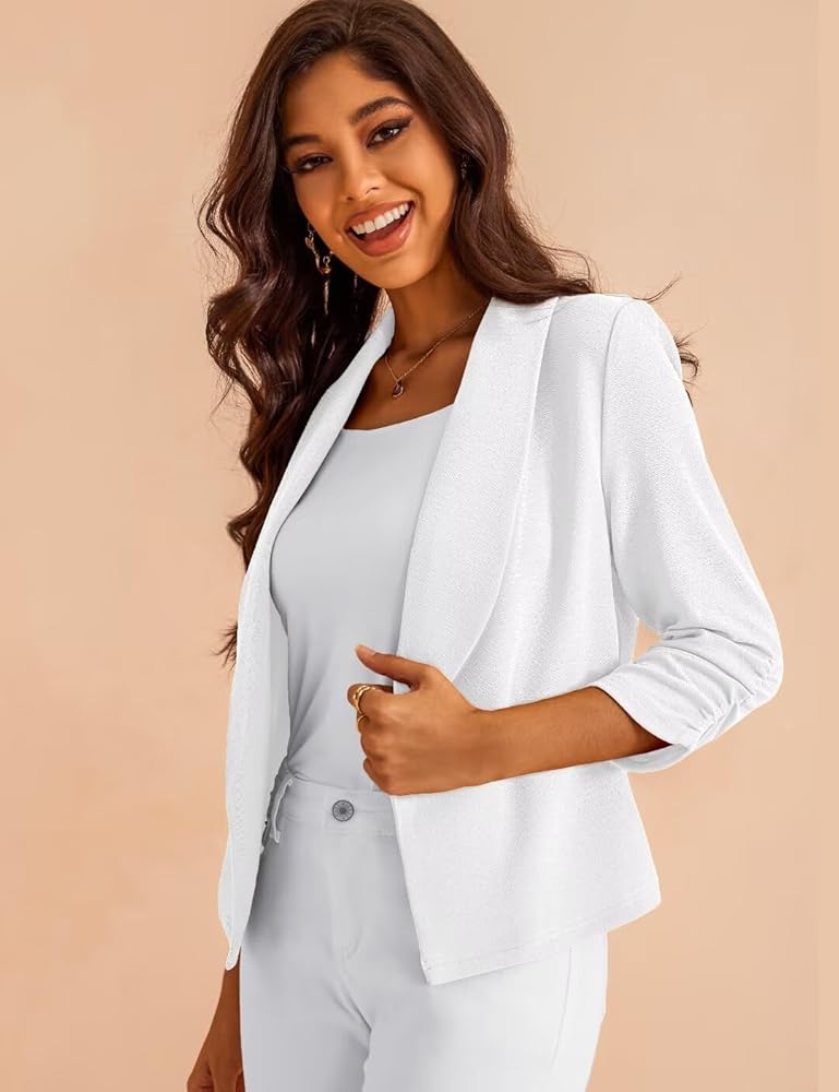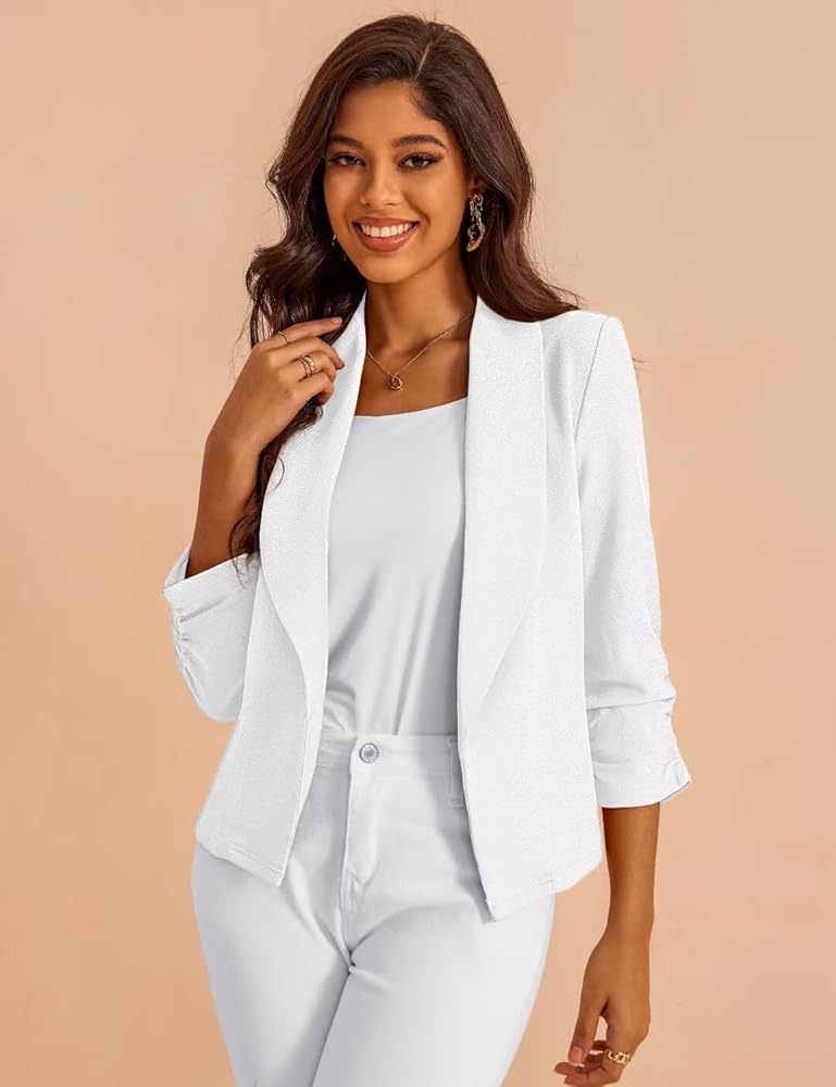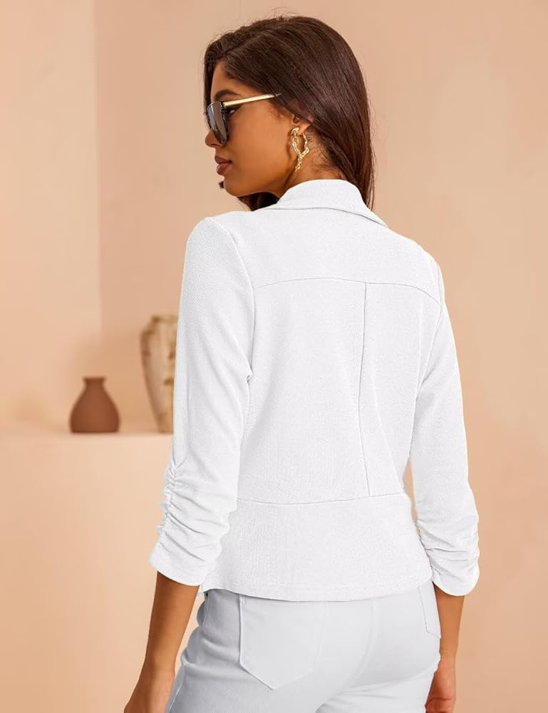 طية صدر كلاسيكية، ياقة منسدلة، تصميم مفتوح من الأمام يضيف لمسة عصرية لمظهرك، السترة النسائية ذات الأكمام المكشكشة 3/4 هي القطعة المفضلة لديك لتعدد الاستخدامات.