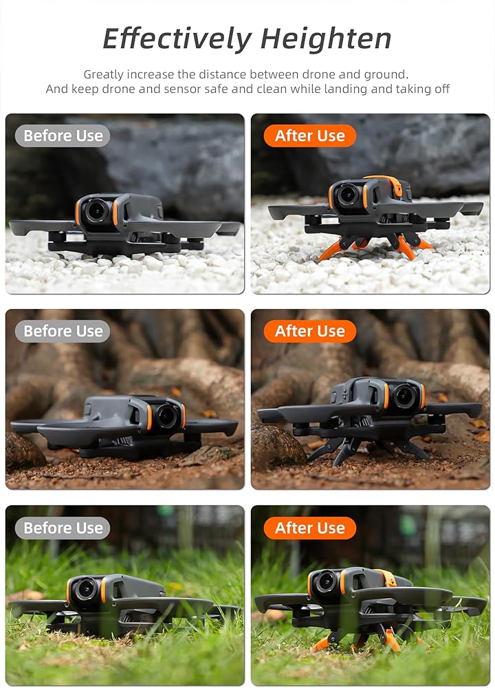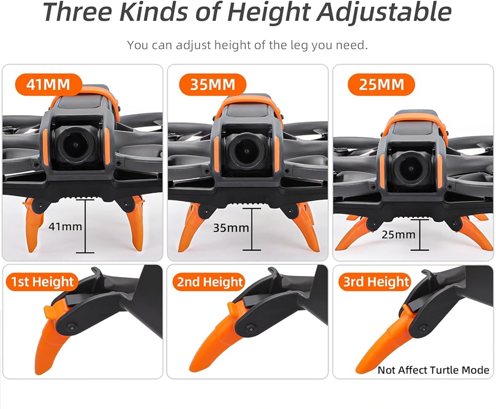 【Effective Height Increase】Adjustable three kinds of height increase, 25mm,35mm,41mm, increasing the distance between the Avata 2 and the ground, effectively preventing the drone, sensors, etc.