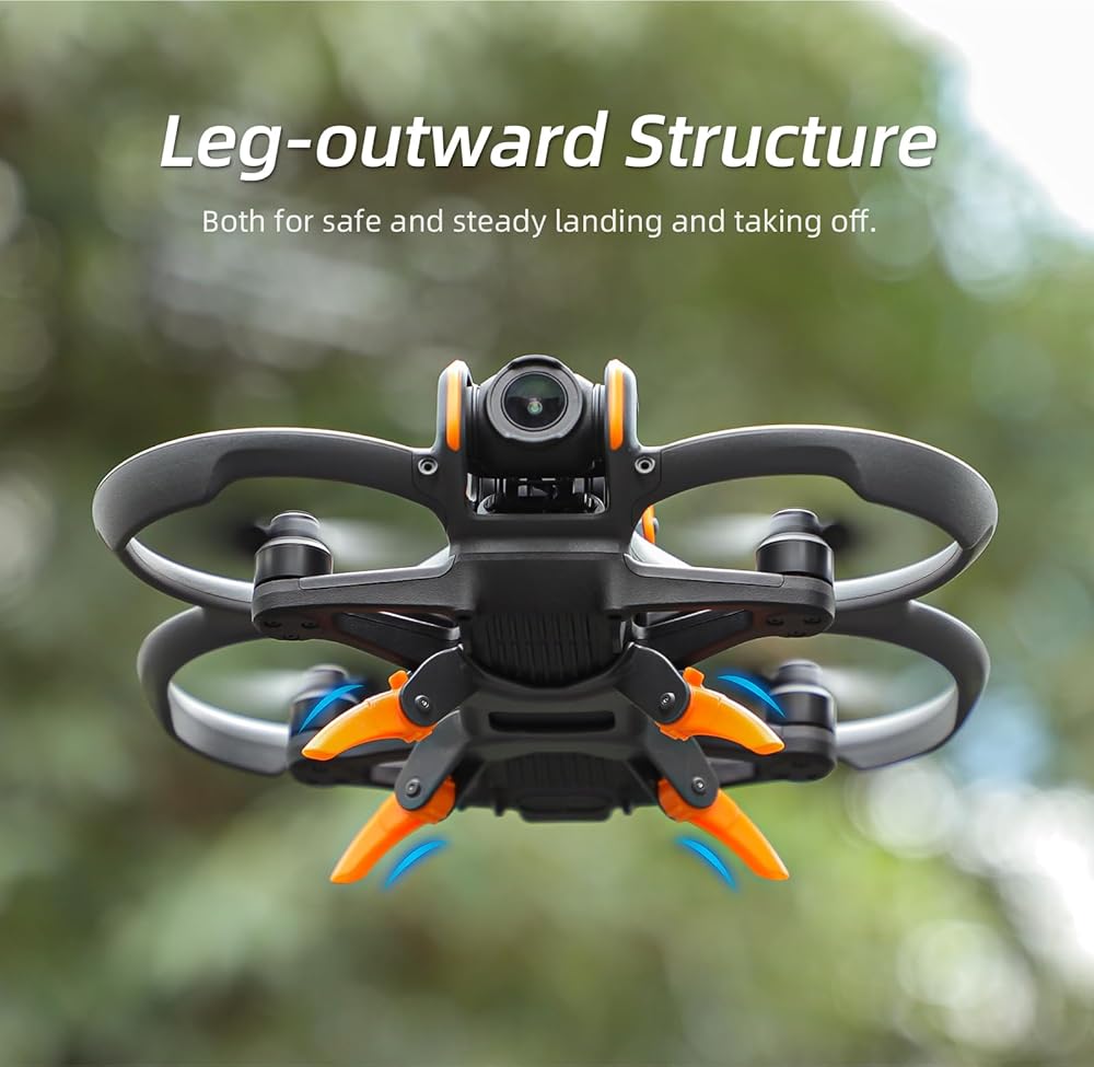 【Sturdy & Resistant】The landing gear for Avata 2 is outer eight structure tripod, stable take-off and landing allow your Avata 2 landing and take off on grass or other rough surfaces, protect the bottom of the drone and the gimbal camera.
