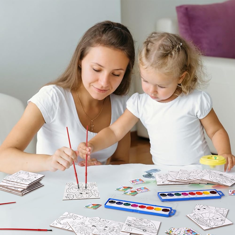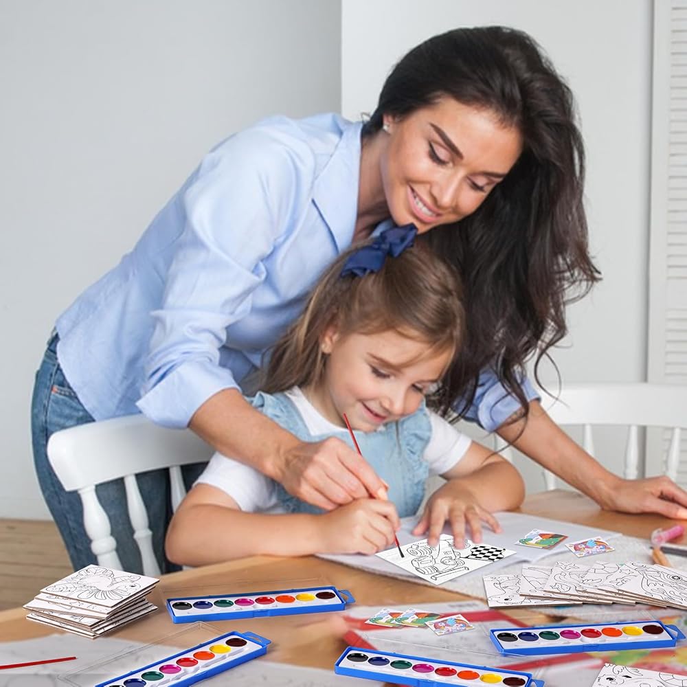 هدية فنية مثالية للأطفال: مجموعة مكونة من قطعة واحدة تحتوي على (1x ألوان مائية مع فرش، 1x قماش صغير مع حامل، 2 × بطاقات ألوان مرجعية، 3x بطاقات تلوين بألوان مائية، 1x بطاقات هدايا، 1x فرش طلاء، 1x سلاسل مفاتيح، 1x ملصقات طلاء، 2 × كيس شفاف)، ما عليك سوى ترطيب الفرشاة بالماء ووضعها على كتلة الألوان المائية لتطبيق اللون. اكتب الاسم على بطاقات الهدايا "إلى" و"من" وشاركها مع أصدقائك، إنه أفضل تعبير عن الصداقة، الرعاية والتقدير والمرح.