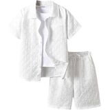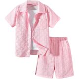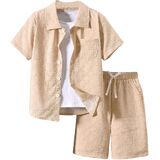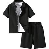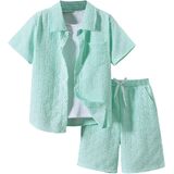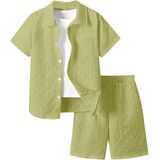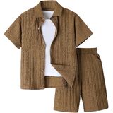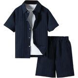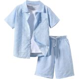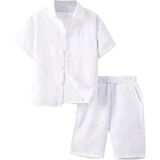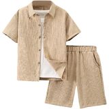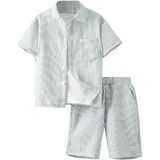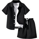 • Features: 2 piece outfit for boys, textured, collared neck, short sleeve, button front, drawstring waist, elastic high waist, slant pocket, wide leg, solid