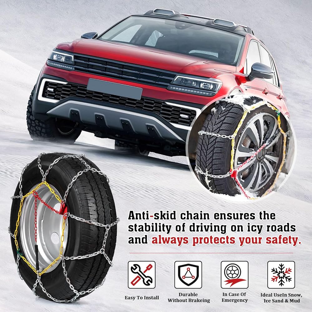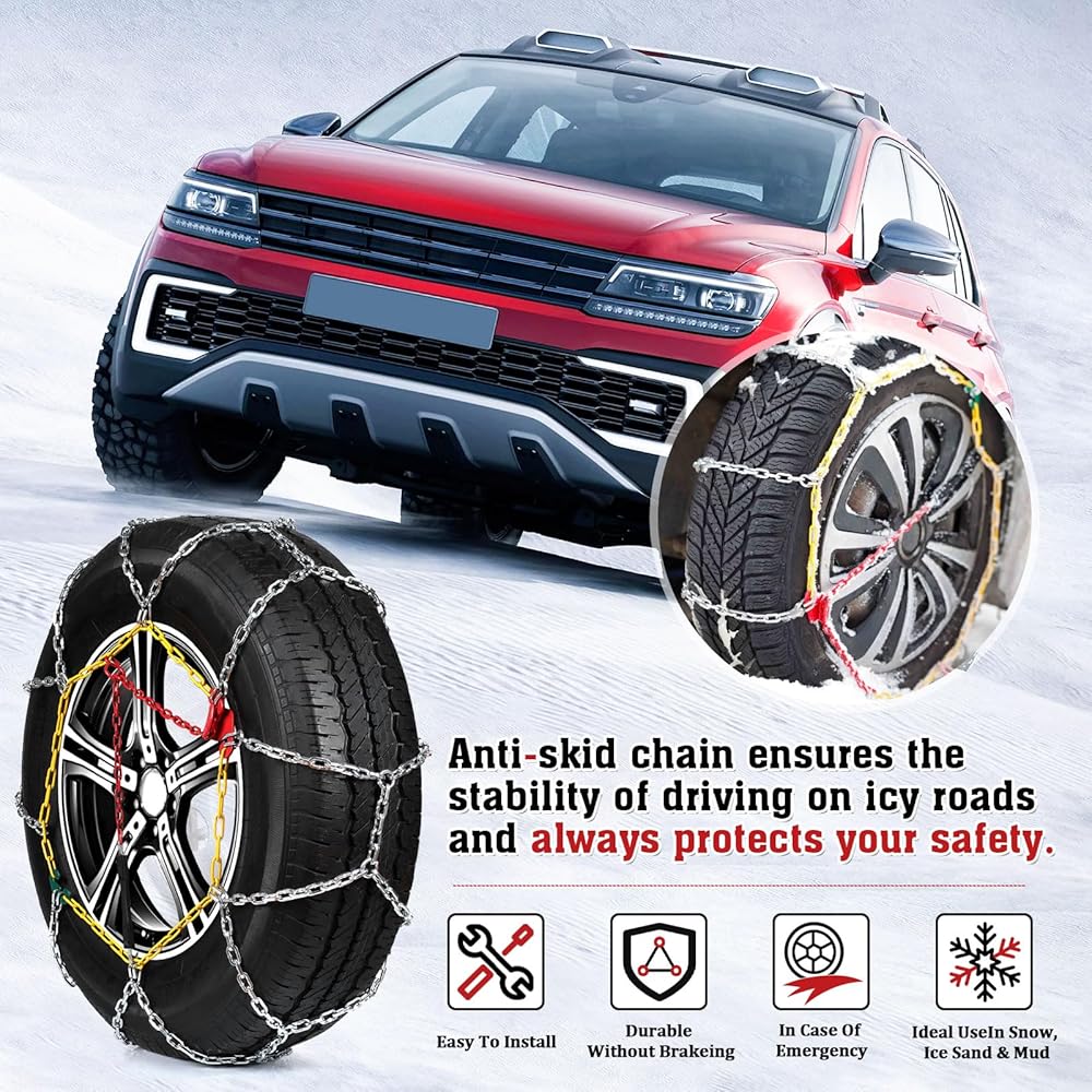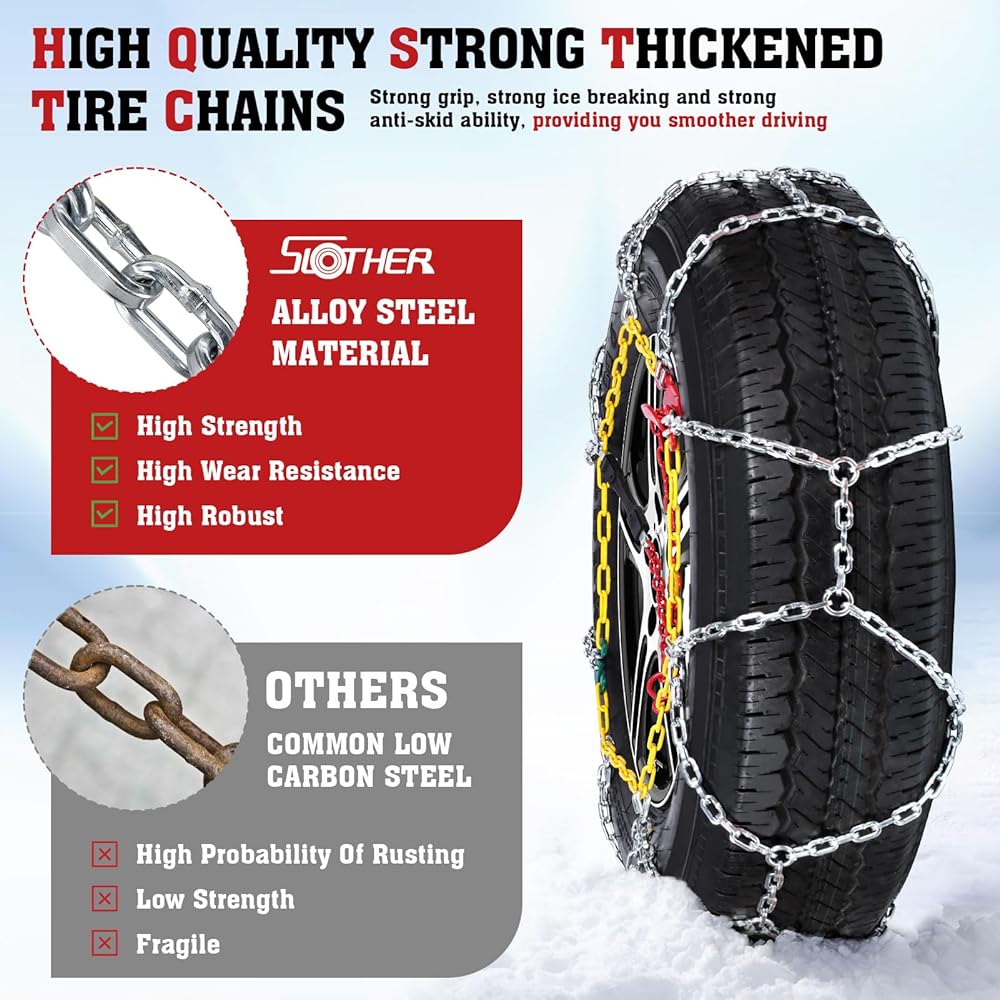 𝐇𝐈𝐆𝐇 𝐐𝐔𝐀𝐋𝐈𝐓𝐘 𝐌𝐀𝐓𝐄𝐑𝐈𝐀𝐋: سلاسل انزلاق الإطارات مصنوعة من الفولاذ عالي الجودة من سبائك المنغنيز. يمكن لهذه المادة أن تتحمل الطقس البارد الشديد دون الإضرار بالإطارات، وتضمن مقاومة ممتازة للتآكل وطول العمر حتى في أقسى ظروف الشتاء. يتميز هيكل السلسلة ذو الشكل الماسي الخاص بنا بخصائص قوية مضادة للانزلاق وهو مثالي للقيادة في حالات الطوارئ على الثلج والجليد. إنه يعزز الإمساك بشكل فعال ويخترق الجليد بسرعة، مما يحسن بشكل كبير من سلامة قيادتك.