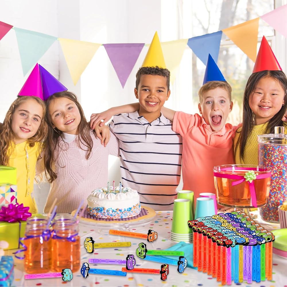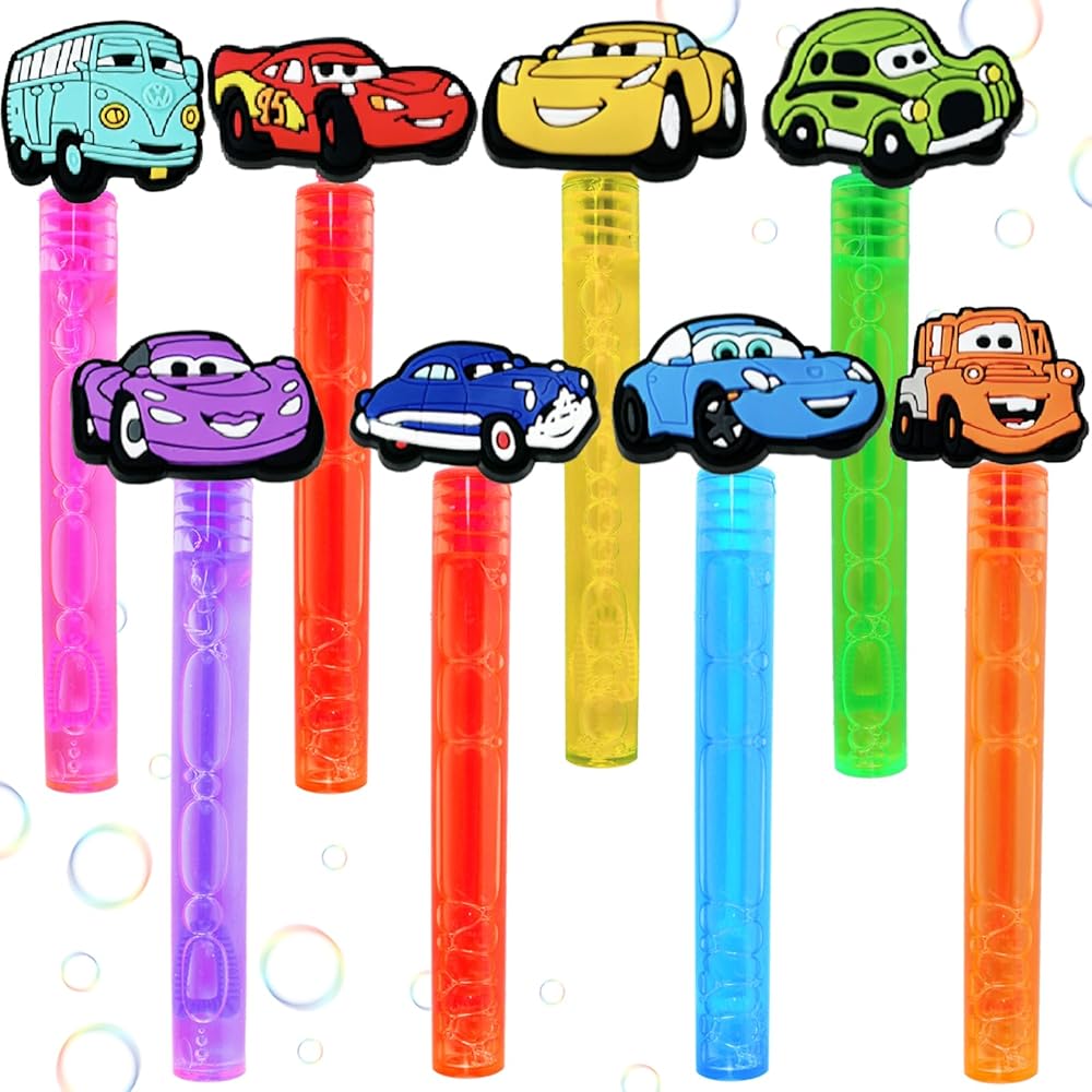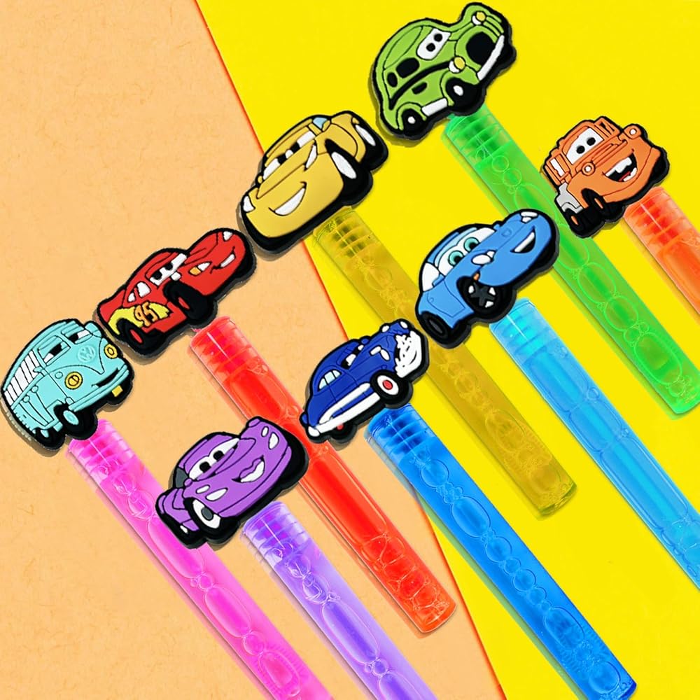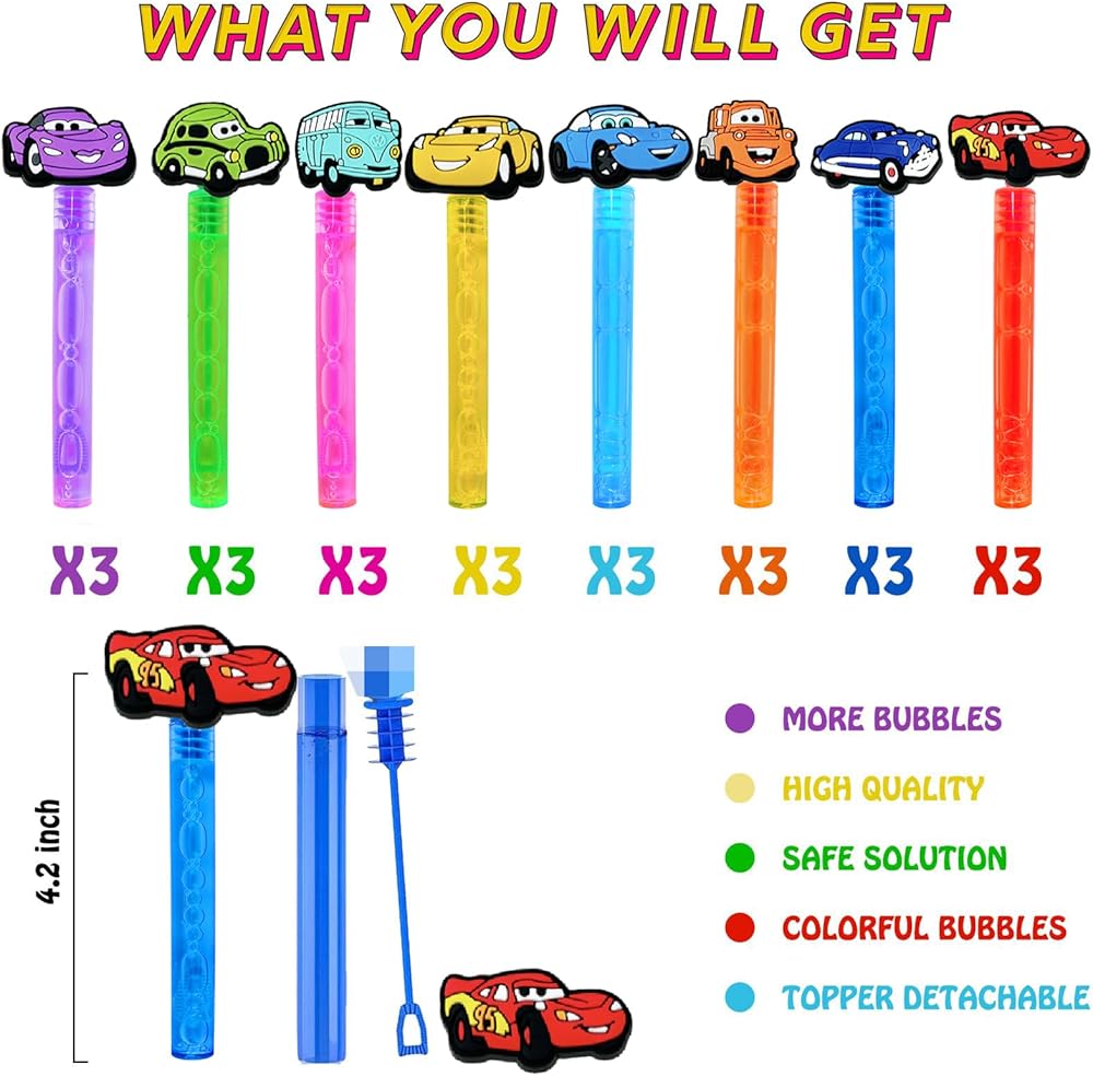 Car Bubbles :Each 24 pcs Car Bubbles, in 8 style of random Car.Cute Car theme design supplies different fun for kids.