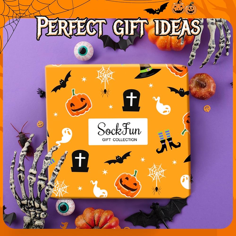 أكسسوارات أزياء الهالوين: جوارب الهالوين هذه مزينة بعناصر الهالوين مثل القرع وأنسجة العنكبوت والحلوى والخفافيش.