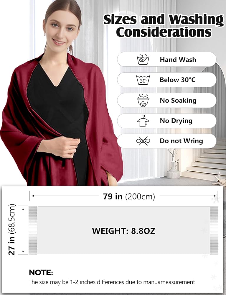 الحجم القياسي والسمك المتوسط: وشاح الكشمير الخاص بنا يبلغ حوالي 27 × 78 بوصة (70 × 200 سم) قياس يدوي، قد يكون هناك خطأ زائد أو ناقص 3 سم أو نحو ذلك؛ إنه متوسط السُمك، ومناسب لجميع المواسم، وجميع الأحوال الجوية في عام واحد كوشاح الباشمينا للنساء/الرجال، أو أغطية الرأس، أو الوشاح، أو الحجاب، أو البطانية أو غطاء الليل وما إلى ذلك. إنه جيد التهوية وأكثر نعومة مرتين من القطن، مما يترك ملمسًا دافئًا ومريحًا. لبشرتك