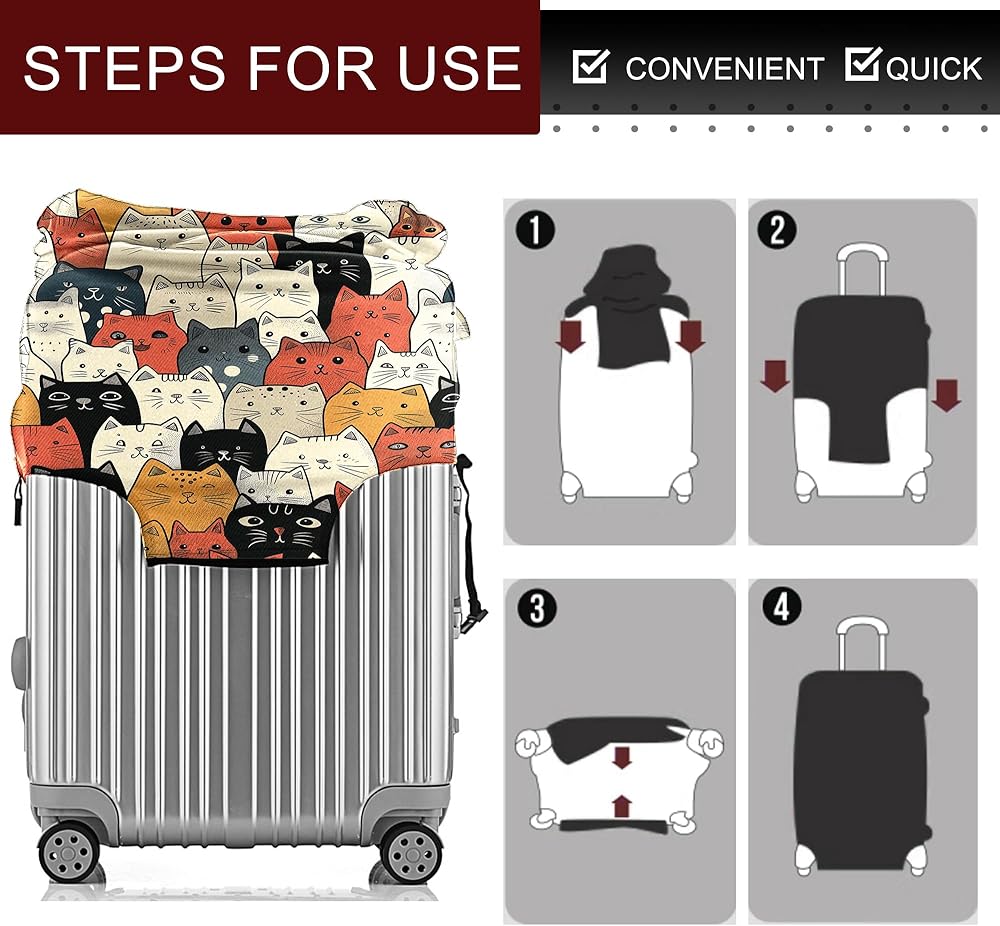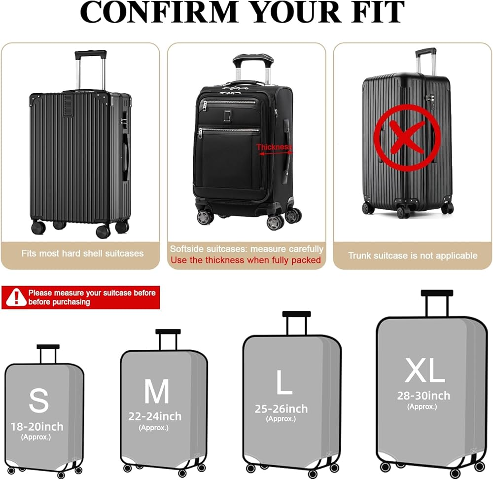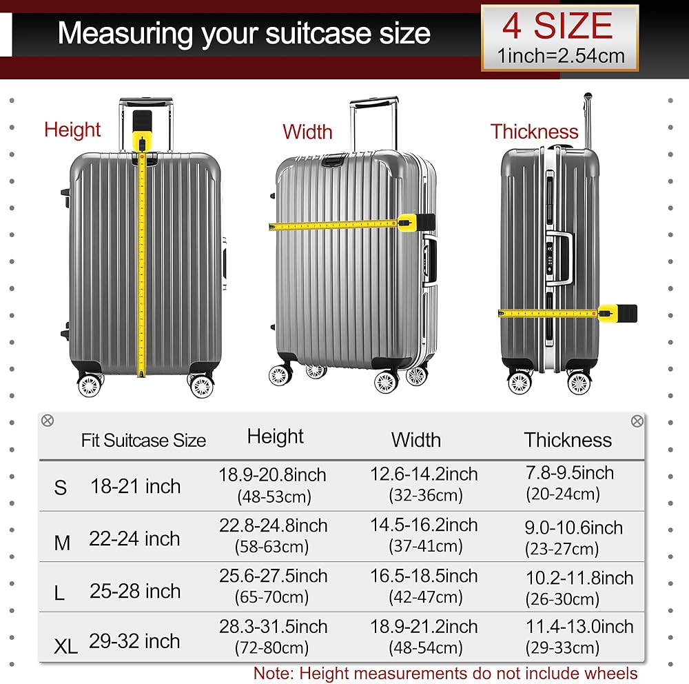 There are 4 sizes to choose from, suitable for almost all suitcases. S: Suitable for 18-21 inch suitcases, M: Suitable for 22-24-inch suitcases, L: suitable for 25-28-inch suitcases, XL: suitable for 29-32 inch suitcases. Please refer to the size measurement method of the details to select the size accurately.