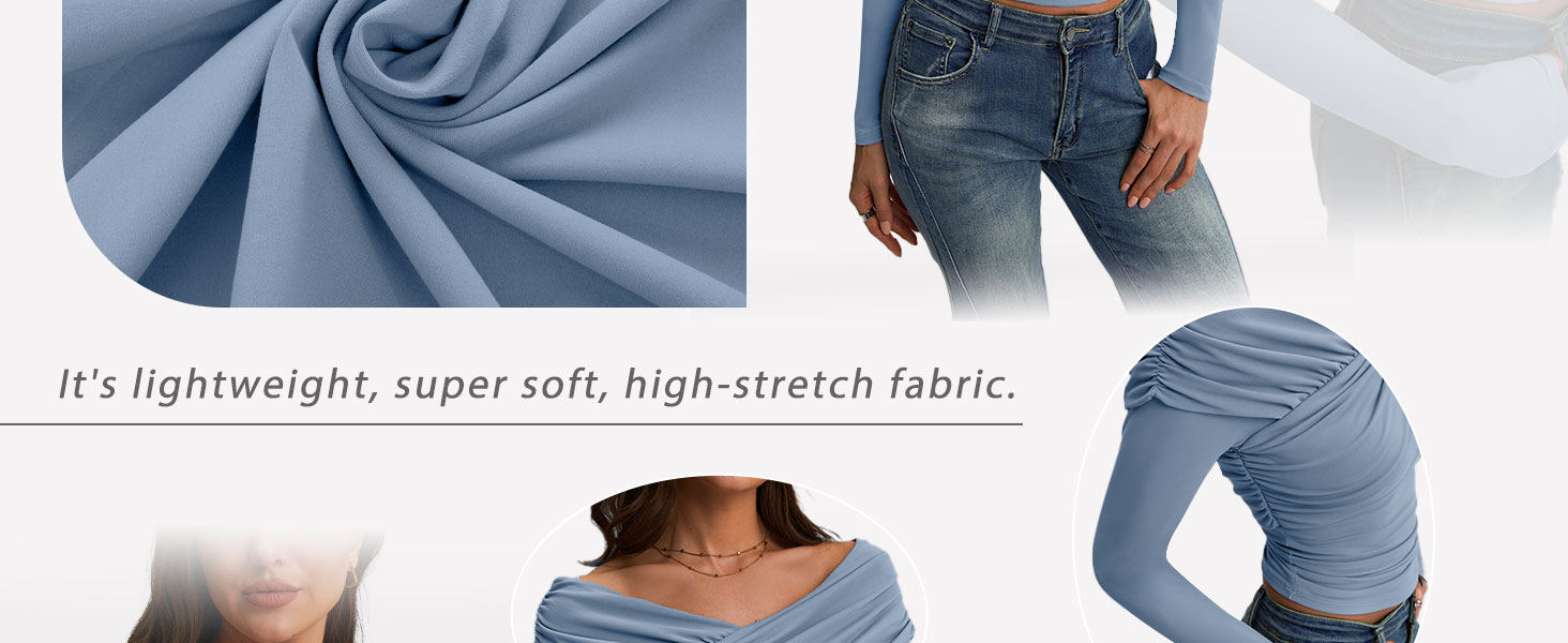 المواد: قمصان طويلة الأكمام للنساء، قمصان بدون أكتاف، ملابس علوية للخروج. مصنوع من 88% بوليستر و12% ألياف لدنة. قماش خفيف الوزن، فائق النعومة وعالي التمدد مع ملمس يشبه الجلد الثاني.