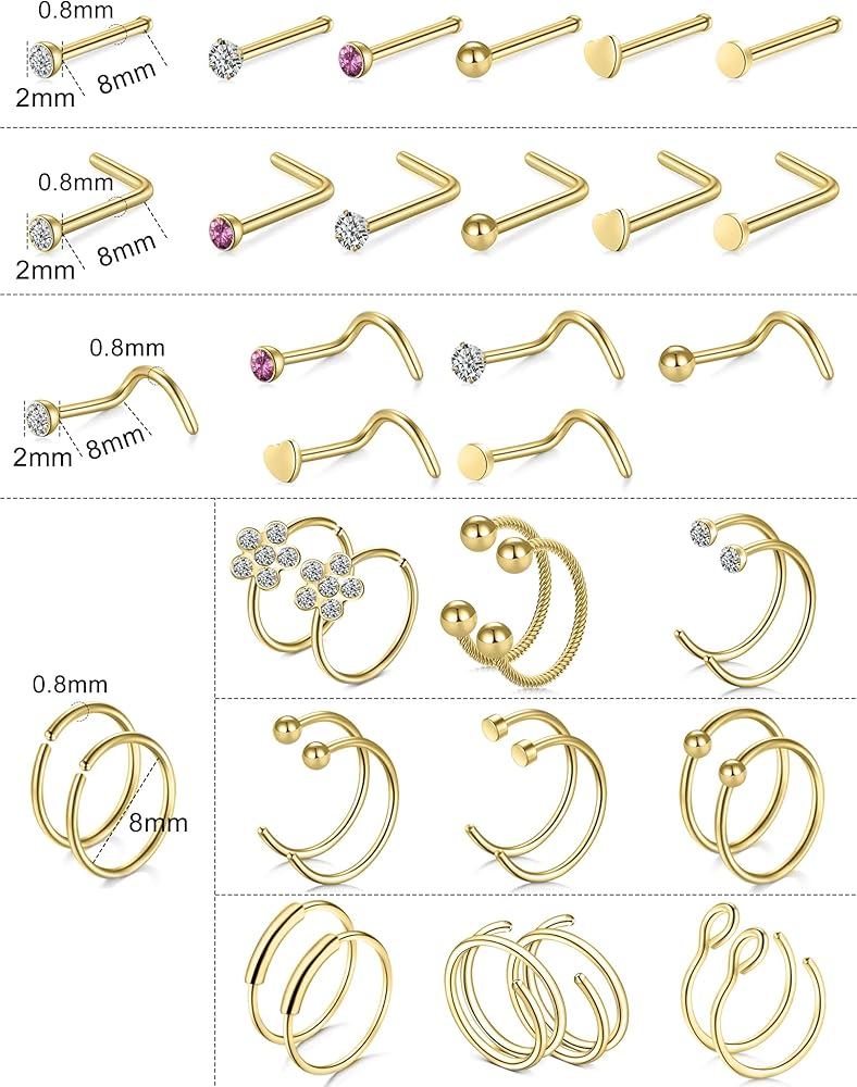 التعبئة والحجم - تتضمن العبوة 38 قطعة من حلقات الأنف وصندوق. جميع حلقات الأنف والأزرار بحجم 20 جم (0.8 مم). تتضمن 20 حلقة أنف و18 مسمار أنف.