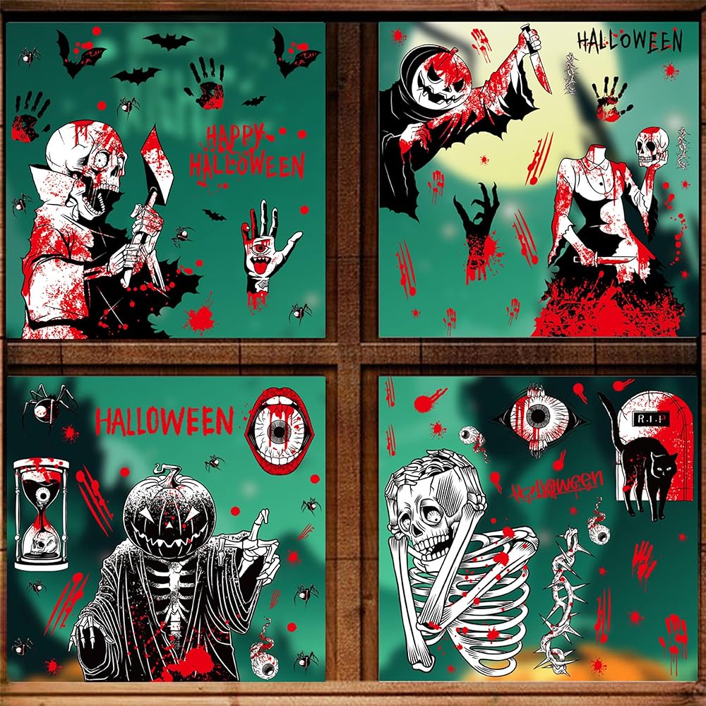 【Frightening Halloween Skull Decor】These Halloween window stickers feature terrifying skulls and horror elements, perfect for creating a truly chilling atmosphere for your Halloween celebrations. The vivid, blood-red and black designs are sure to catch the eye and add an eerie touch to any window or glass surface.