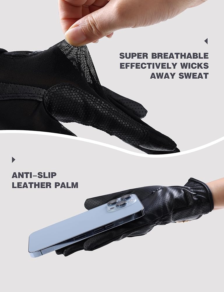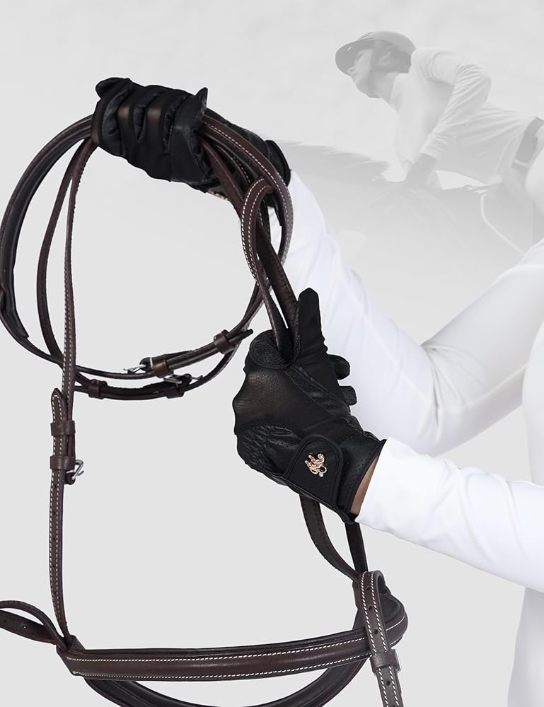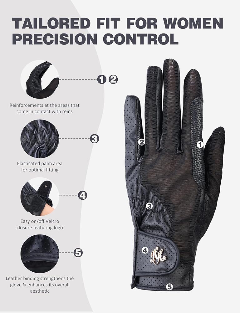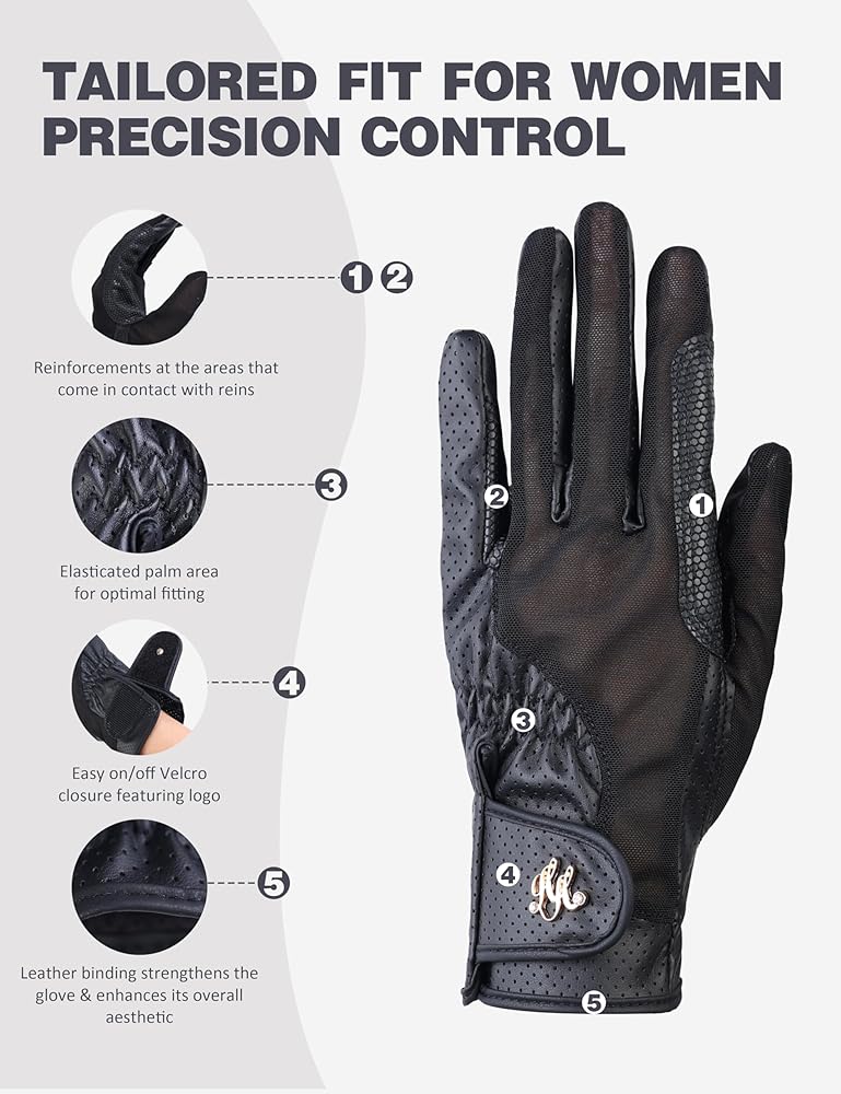 تناسب مثل الجلد الثاني: تم تصميم القفازات لتناسب يد المرأة بشكل مريح، مثل الجلد الثاني، مما يوفر قبضة فائقة وحساسية للمس، مما يجعلها خيارًا مثاليًا للتعامل مع الزمام أثناء الركوب.