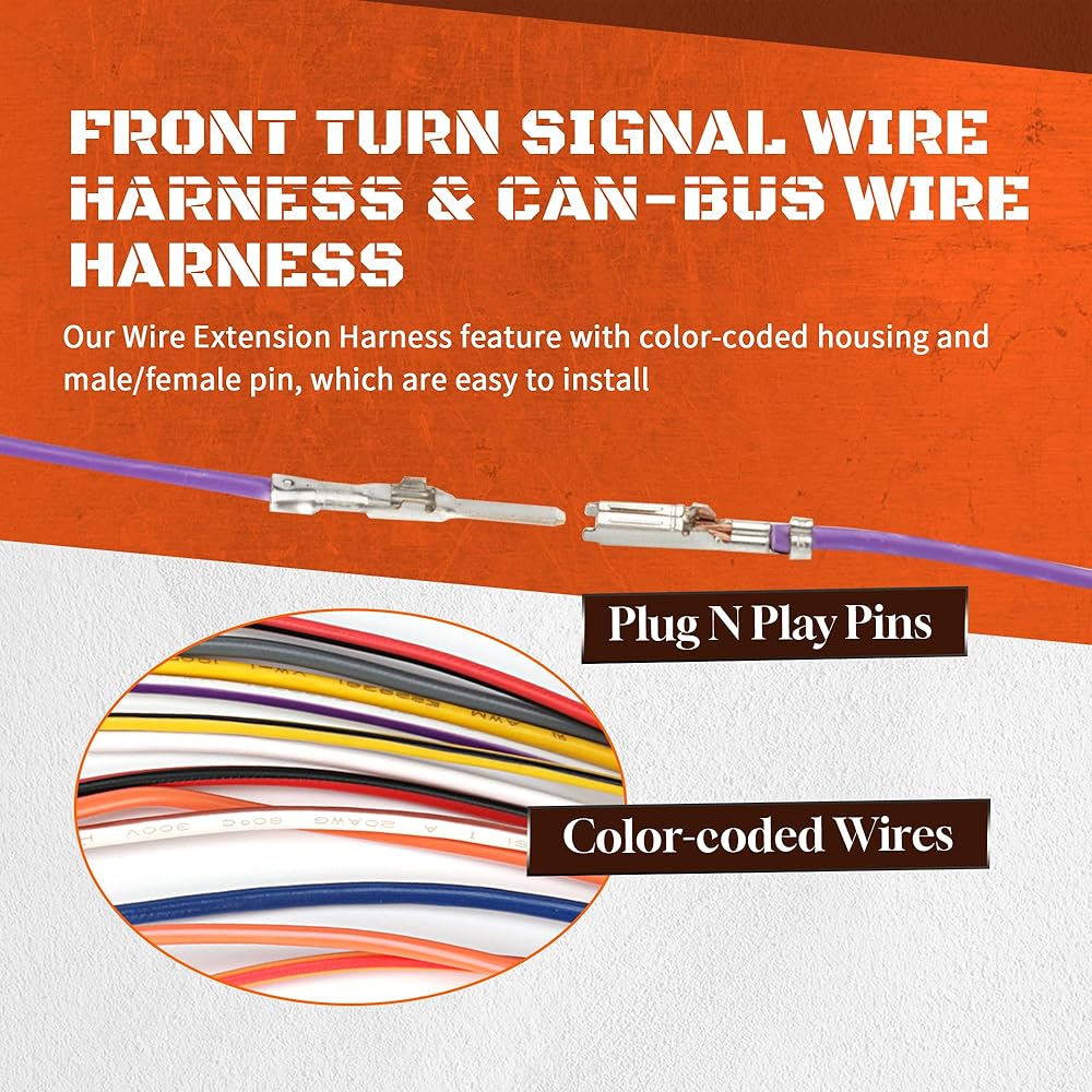 حرفية متقنة - تم تصنيع إشارة الانعطاف الأمامية وحزام أسلاك CAN-Bus من مادة البولي إيثيلين شديدة التآكل والمقاومة للحرارة، بالإضافة إلى أنها مصممة بعناية باستخدام أسلاك مرمزة بالألوان وتأتي مع أنابيب تقلص الحرارة لتبسيط تقدم التثبيت الخاص بك