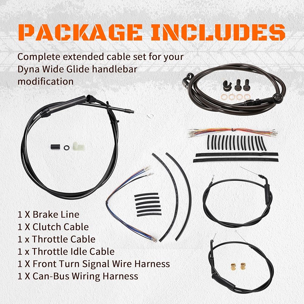 مجموعة تمديد أسلاك Dyna الكاملة - تتضمن الحزمة 1 × خط الفرامل، 1 × كابل القابض، 1 × كابل الخانق، 1 × كابل الخانق الخامل، 1 × سرج سلك إشارة الانعطاف الأمامي، 1 × سرج أسلاك Can-Bus. مجموعة تمديد سلك داينا الاحترافية مصممة لتعديل مقود هارلي الخاص بك. يوصى بالتركيب الاحترافي