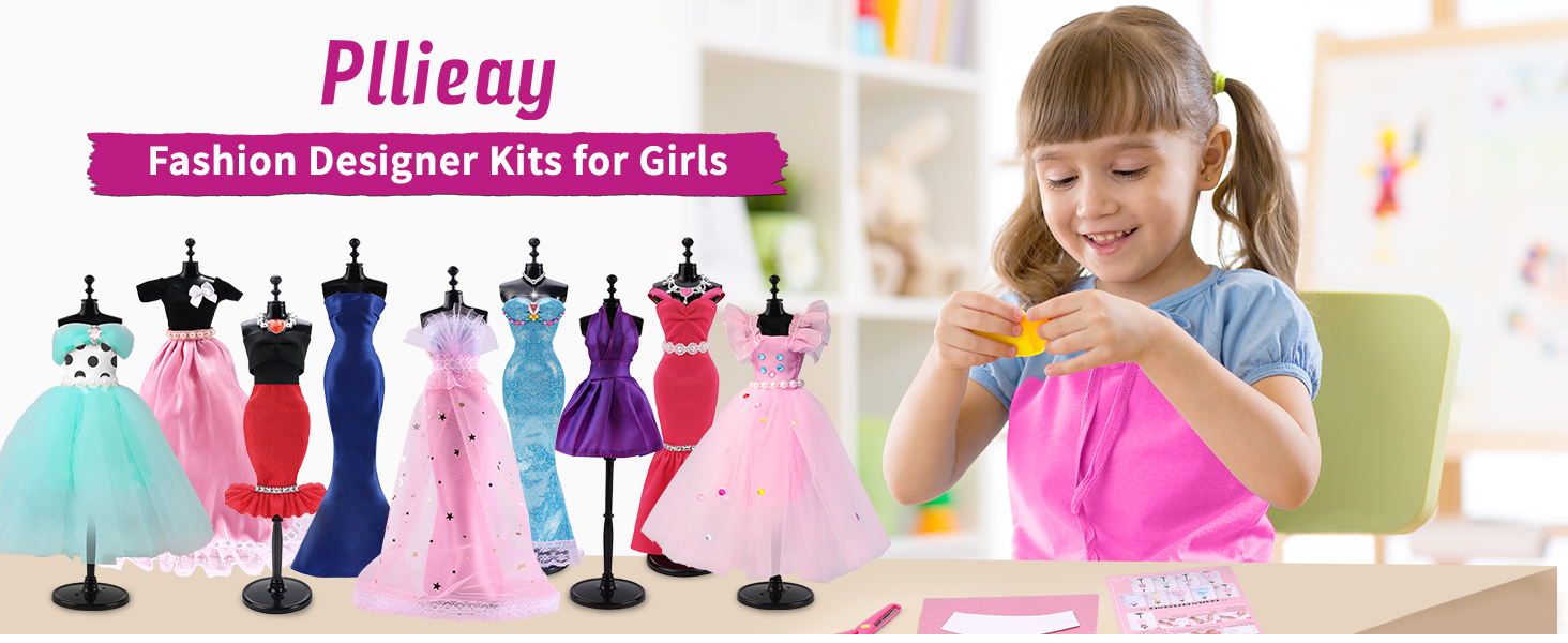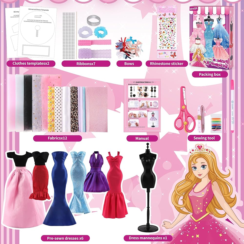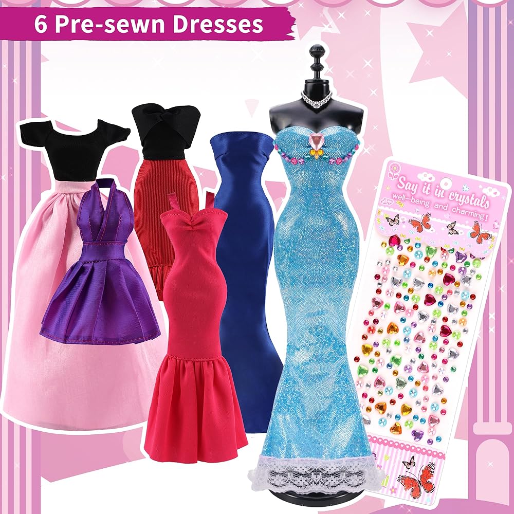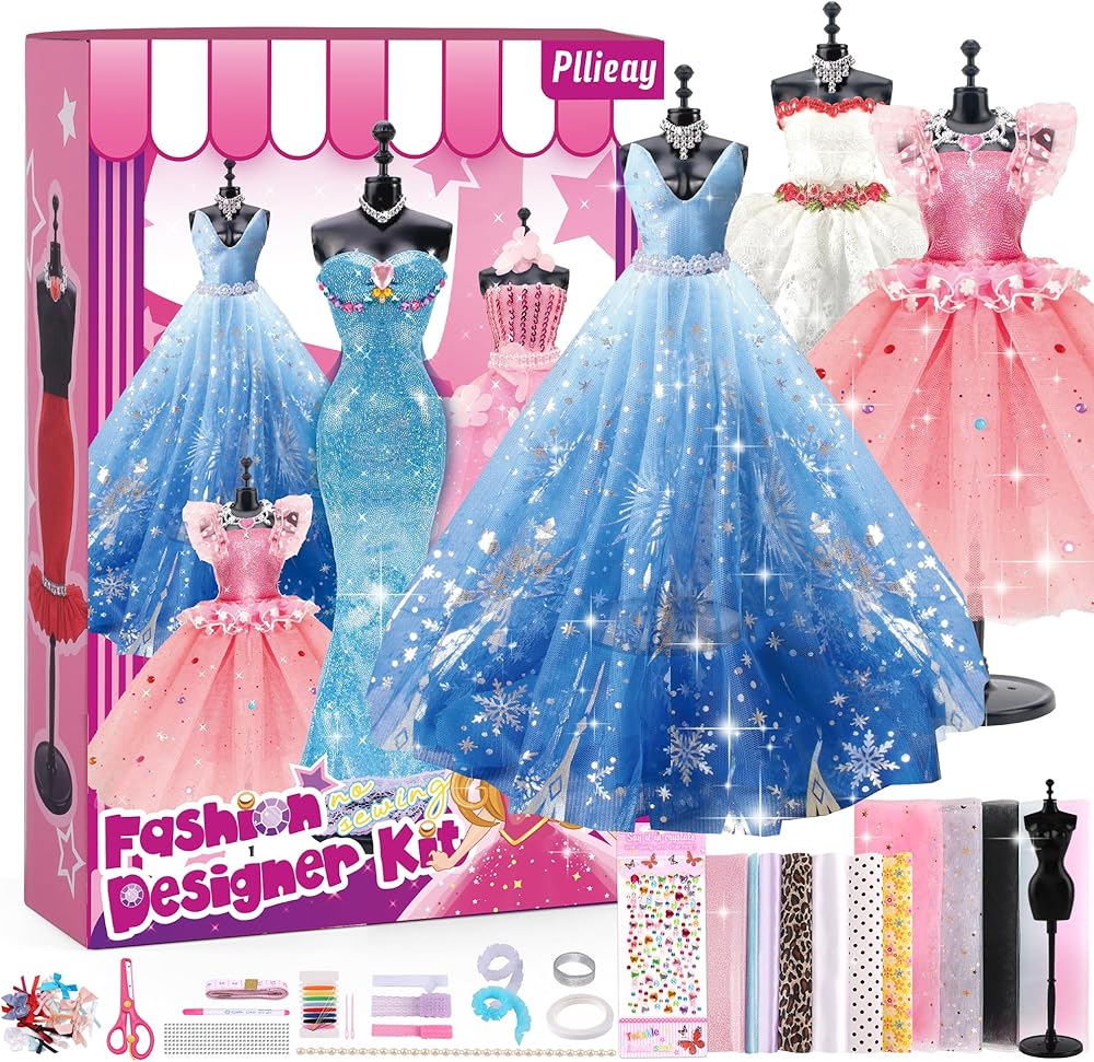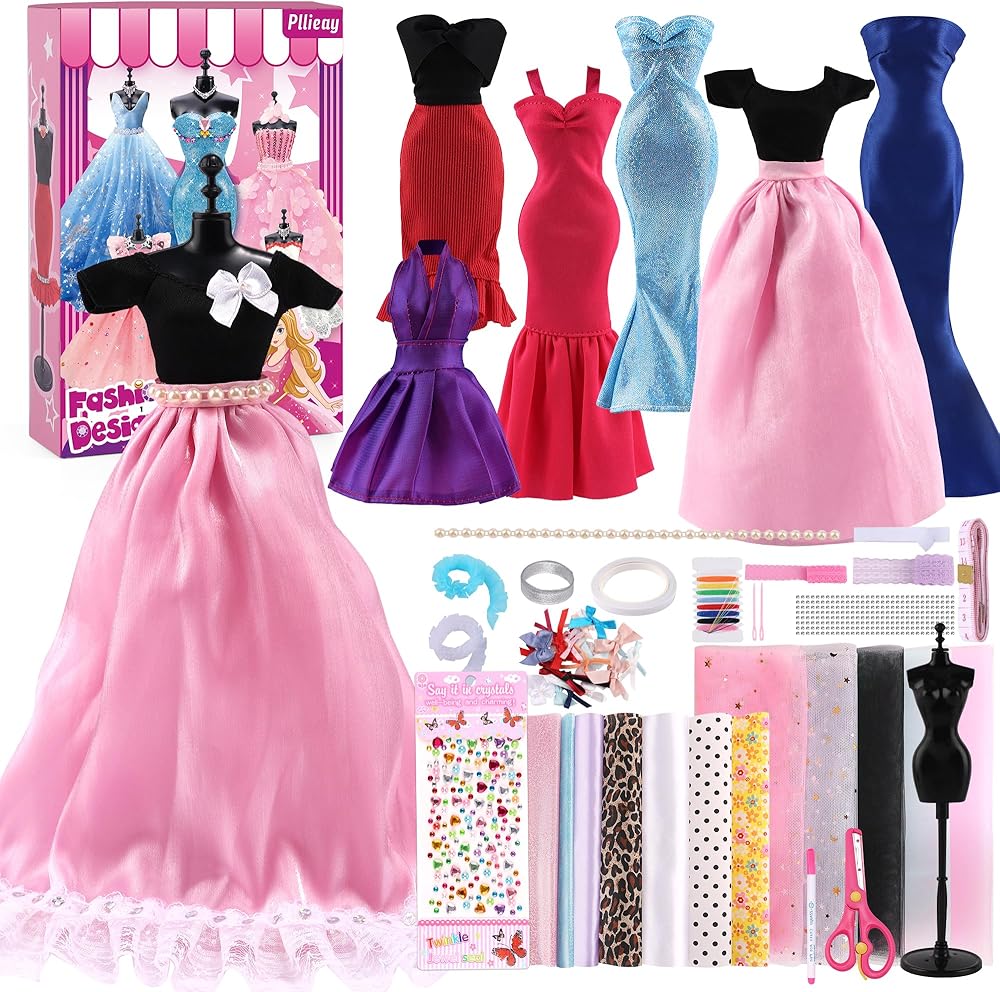 مجموعة مصمم الأزياء من Pllieay للفتيات مجموعة الخياطة مجموعة الفنون والحرف اليدوية الإبداعية مع مجموعة ملابس DIY مع عارضة أزياء، 6 فساتين مقطوعة مسبقًا، 11 إكسسوارات من القماش والدمى للفتيات والأطفال هدية عيد ميلاد