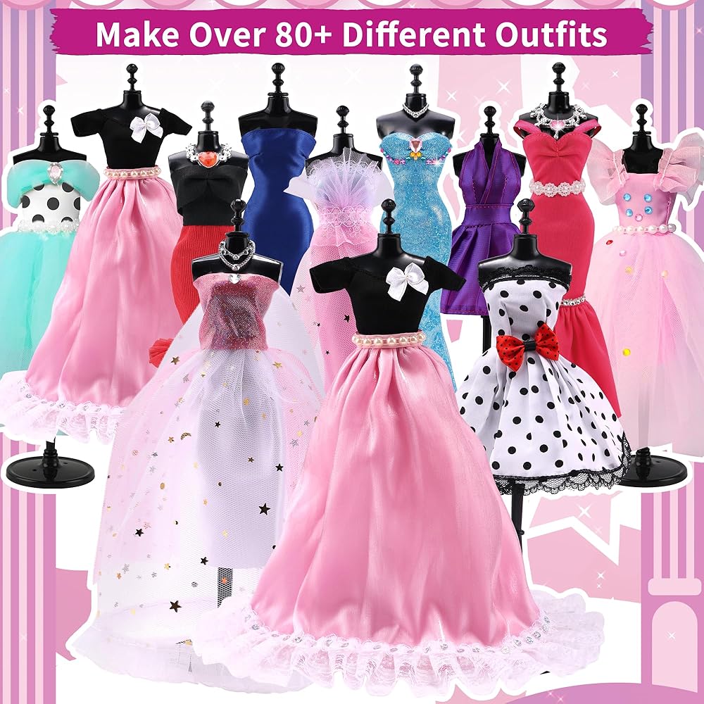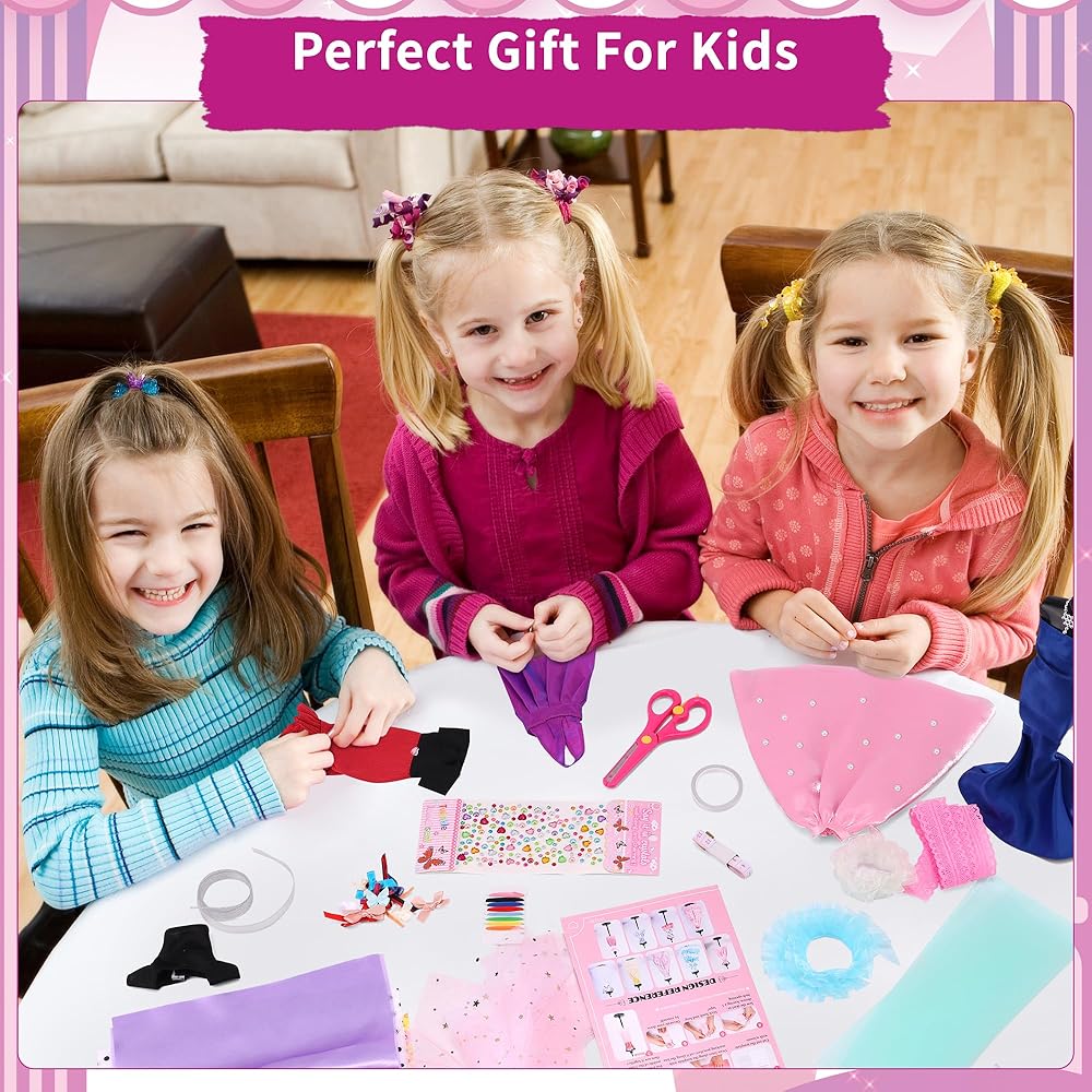 مجموعة ملابس شاملة يمكنك صنعها بنفسك: تتضمن مجموعات مصممي الأزياء للفتيات أكثر من 200 قطعة من المواد لإنشاء أكثر من 20 زيًا مختلفًا. تحتوي المجموعة على 1 عارضة أزياء فستان، 6 فساتين مقصوصة مسبقًا، 2 قالب ملابس، قلم قابل للذوبان في الماء، شريط قياس، 12 قماشًا، 7 حواف، مقص، أدوات خياطة، مجموعة خياطة للأطفال، 15 قوسًا، وملصقات من حجر الراين.