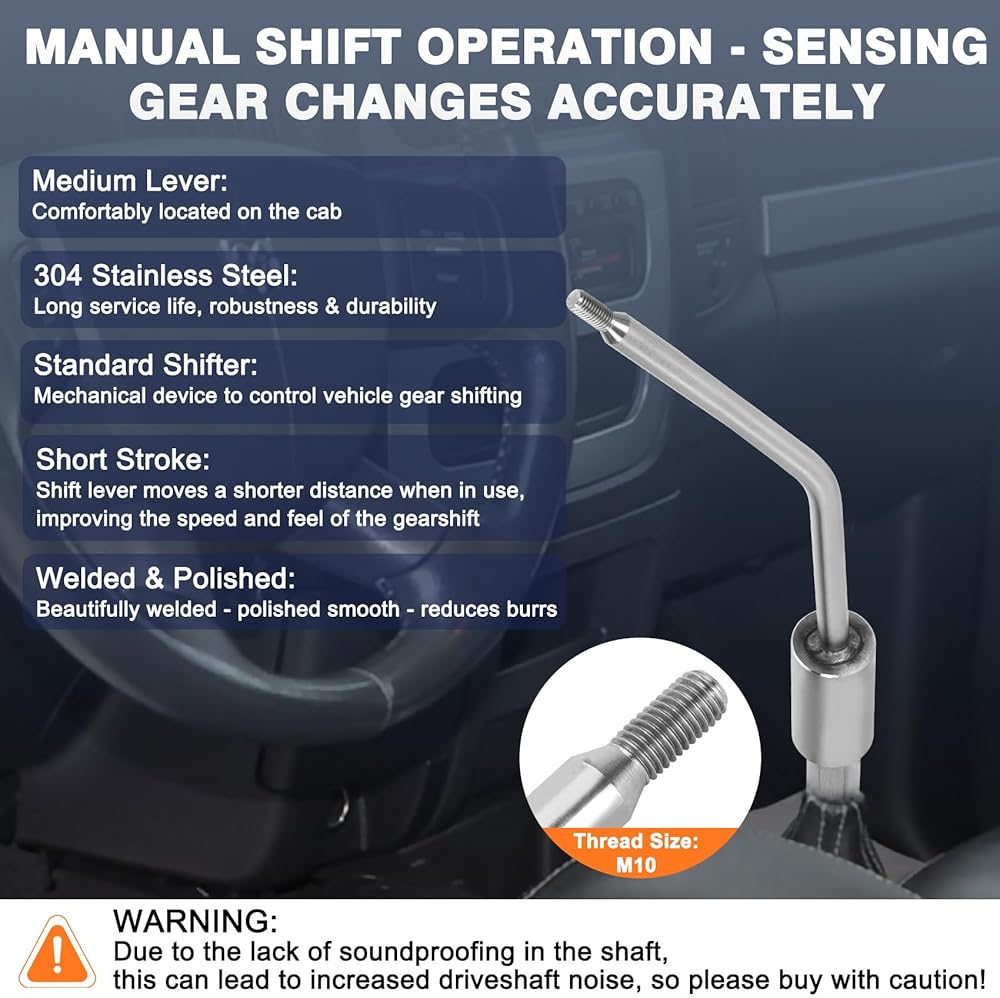مادة عالية الجودة - آمنة ومتينة: مناسبة لشاحنة دودج رام ذات الرمي القصير، الرافعة المتوسطة المنحنية القياسية مصنوعة من لحام الفولاذ المقاوم للصدأ 304. تمت ترقية خيوط M10 العلوية بتصميم متكامل لعمر خدمة أطول. يوفر ناقل الحركة الميكانيكي تجربة قيادة أكثر طبيعية ومرضية، مع الحفاظ على الشعور والتفاعل التقليدي لقيادة السيارة. يتميز ذراع نقل الحركة الميكانيكي، وهو أبسط وأكثر موثوقية من الأجهزة الإلكترونية أو الكهربائية، بموثوقية أعلى وعمر خدمة أطول في البيئات القاسية أو ظروف الطريق القاسية.