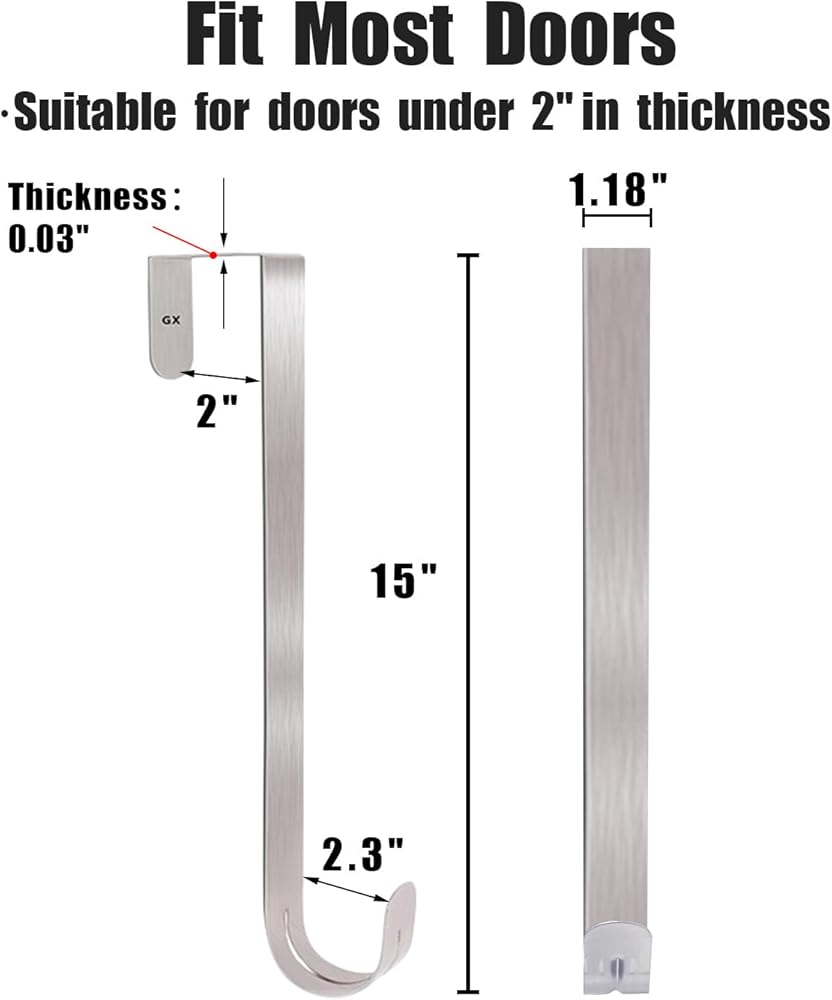 تصميم نحيف للغاية: يبلغ طول شماعة الإكليل هذه 12 بوصة وعرضها 1.18 بوصة، وسمكها 0.03 بوصة فقط. وهذا يسمح بربطه بالأبواب دون التسبب في تلف الباب أو الإطار عند فتحه أو إغلاقه. إنها مناسبة للأبواب التي يقل سمكها عن 1.97 بوصة.