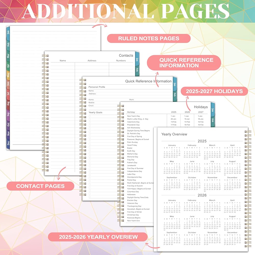 • تصميم شخصي – | غطاء مرن | 2 صفحات اتصال | صفحة النظرة العامة السنوية لعام 2025-2026 | صفحات عطلات 2025-2027 | 2 صفحات اتصال | صفحة المعلومات المرجعية السريعة | مخطط 2025