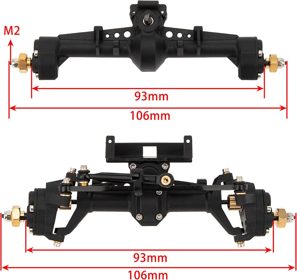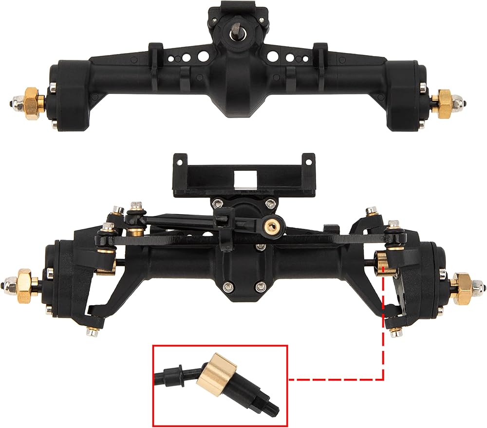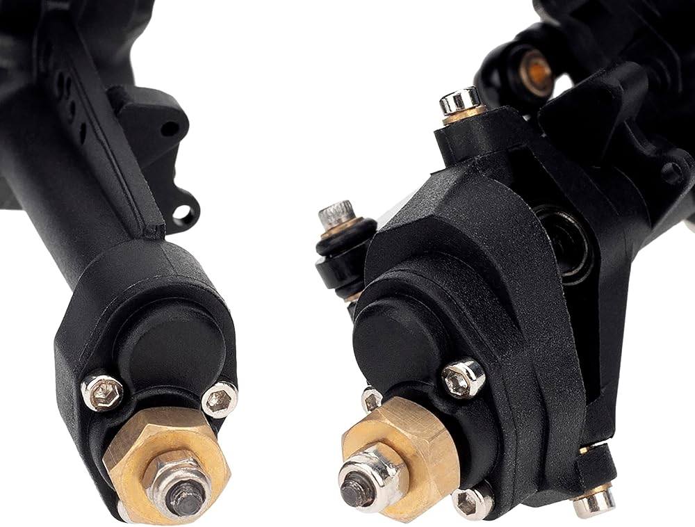 يأتي المحور الأمامي مزودًا بمحور C أكبر ومحور خلفي متكامل. زاوية العجلات 8 درجات للمحور الأمامي وزاوية ميل الدبوس 10 درجات، زاوية مثالية لتحسين ثبات زاحف RC الخاص بك بشكل فعال عند التسلق.