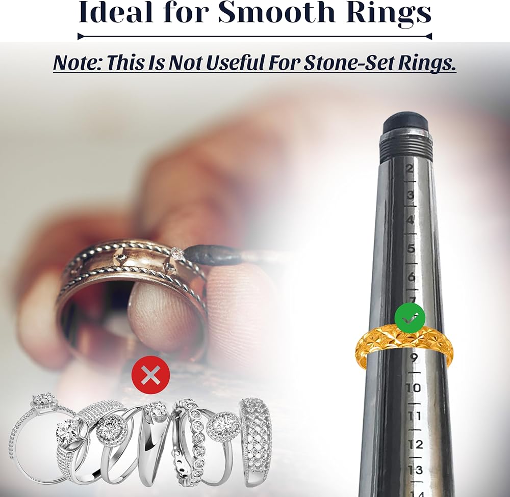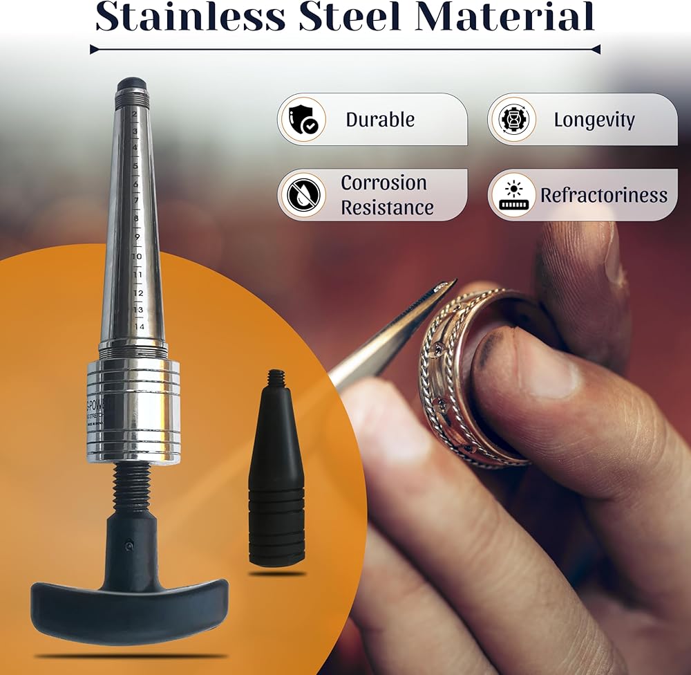 Variable Scale of Sizes: The ring stretcher rod accommodates rings from increased sizes of 2 to 14. These scales are marked on the rod including half sizes.