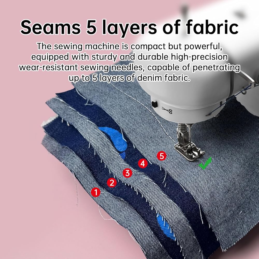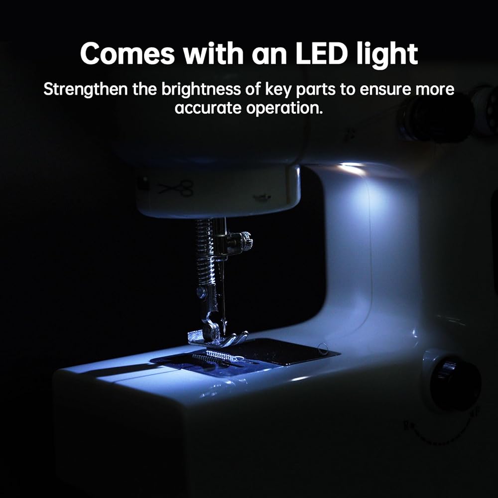 [آلة الخياطة للمبتدئين] تتيح لك الحياكة الثابتة ذات الخيط المزدوج ربط العقد بسهولة، كما أن الدرزات ناعمة وغير عالقة، مما يسمح بتحقيق إبداعك بثبات. باستخدام إبرة 90/14، يكون طرف الإبرة حادًا وله قوة اختراق قوية. يمكنها خياطة 5 طبقات من الأقمشة متوسطة السُمك وليس من السهل أن تتعثر عند الجري بسرعة عالية. طبقات جيدة وقوية. يتيح لك التروسان ضبط سرعة الخياطة بمرونة. ضوء LED مدمج، زاوية تركيز دقيقة، نابض بالحياة يعمل أمامك مباشرة.