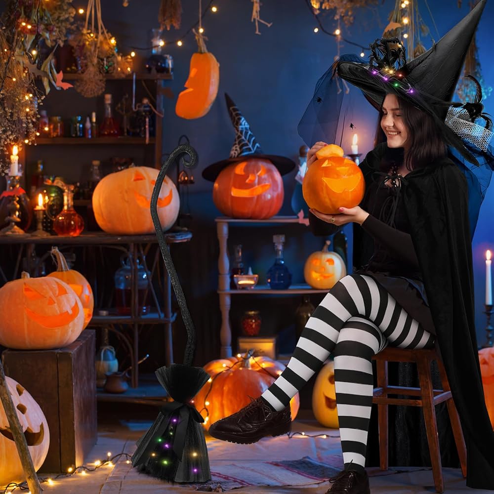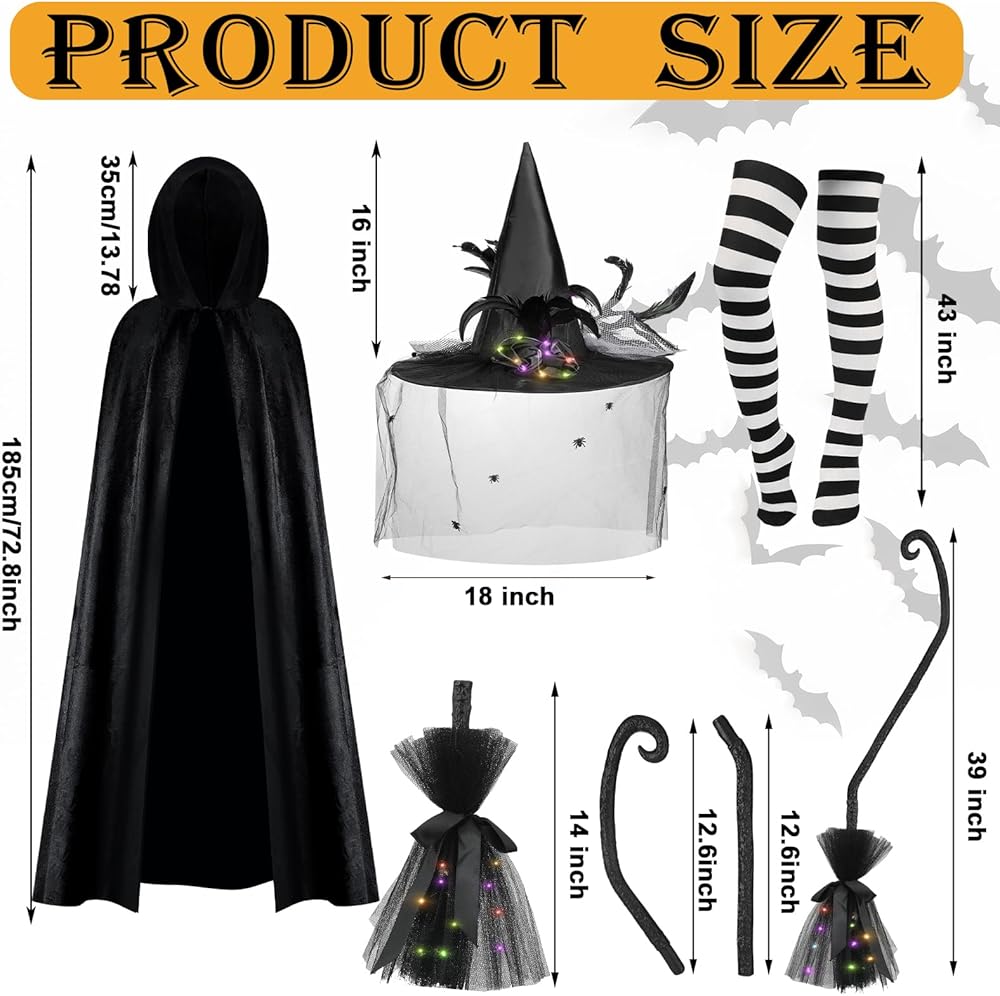 • Package Includes: the package will provide you with 1 piece of witch hat, which measures 23.62 inches/ 60 cm in head circumference, 10.43 inches/ 26.5 cm in height, the brim diameter is 18.11 inches/ 46 cm, the inner diameter is about 7.5 inches, 1 piece of lighted witches broom, which measures 39.37 inches/ 100 cm in length, the end is 14.17 inches/ 36 cm, 1 pair of striped stockings measuring 43.31 inches/ 110 cm, 1 piece of black cape's total length is about 72.83 inches/ 185 cm with a hat
