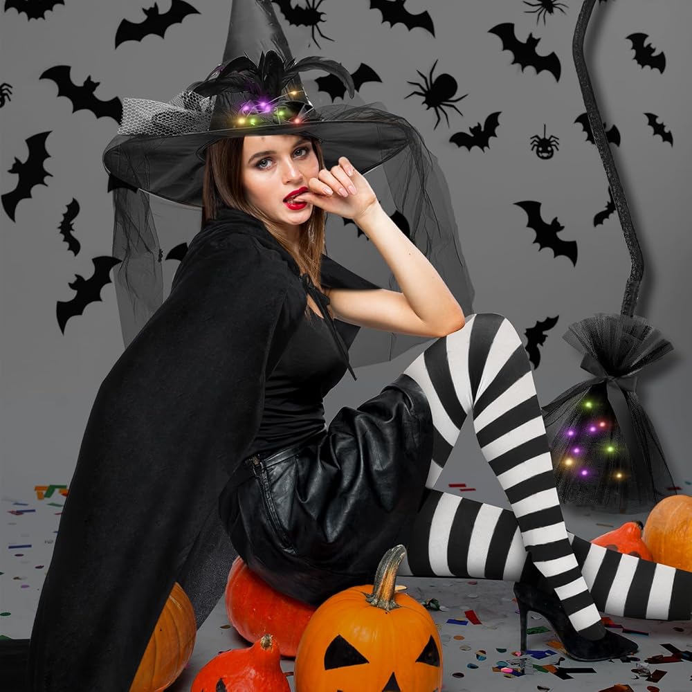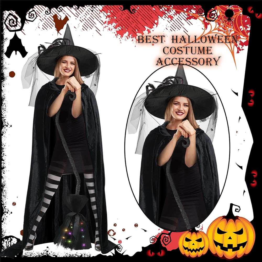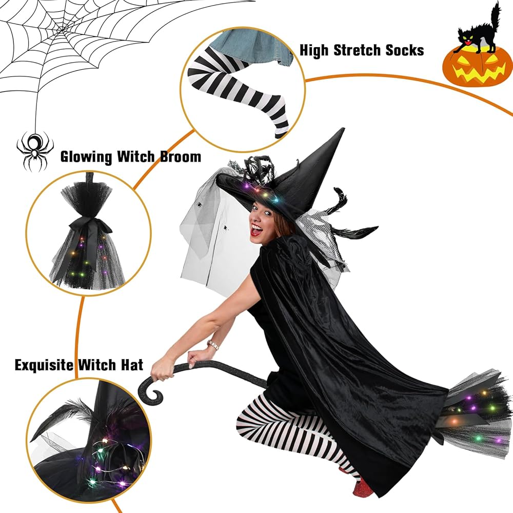 طقم أزياء ساحرة الهالوين 4 قطع من Bonuci، بما في ذلك قبعة الساحرة مع حجاب وريش مكنسة ساحرة مضاءة، جوارب طويلة مخططة، معطف مخملي طويل للنساء، إكسسوارات تنكرية