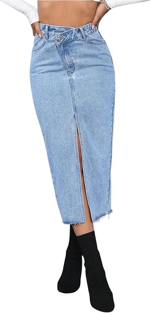 - تنورة جينز متوسطة الطول غير متماثلة، بزر وسحاب، فتحة أمامية، حاشية خام مع جيب