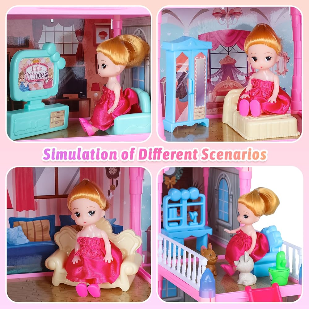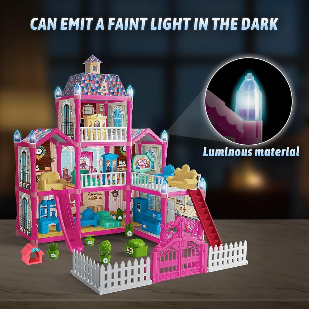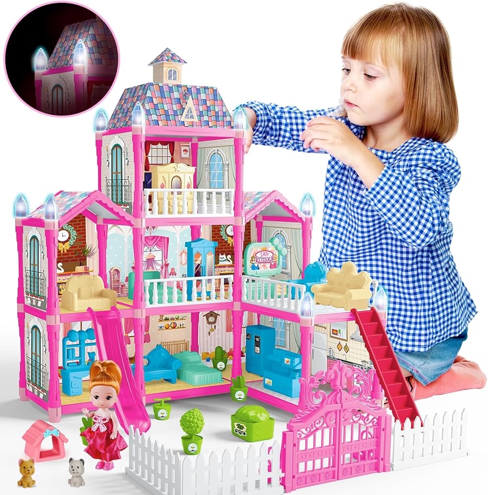 بيت الدمى، بيوت الدمى مع ضوء ليلي، مجموعة لعب بيوت الدمى مع الأثاث والإكسسوارات، مجموعة بيت الدمى الأحلام المكونة من 3 طوابق و8 غرف، مجموعة بيوت الدمى التي يمكنك صنعها بنفسك، بيوت الدمى للفتيات بعمر 3 سنوات فما فوق (وردي)
