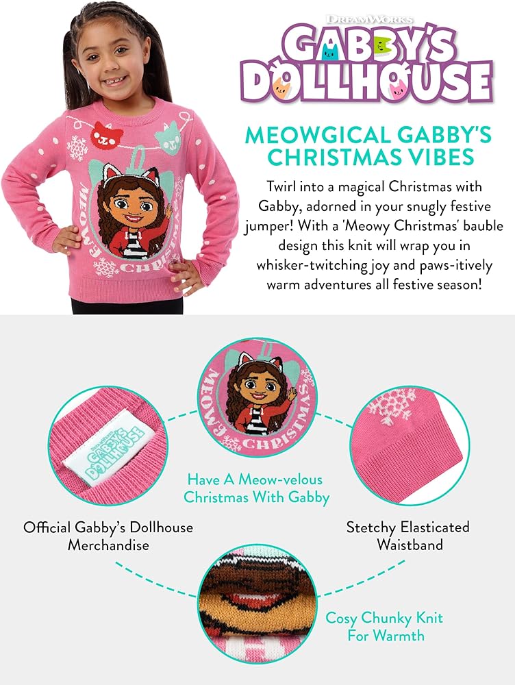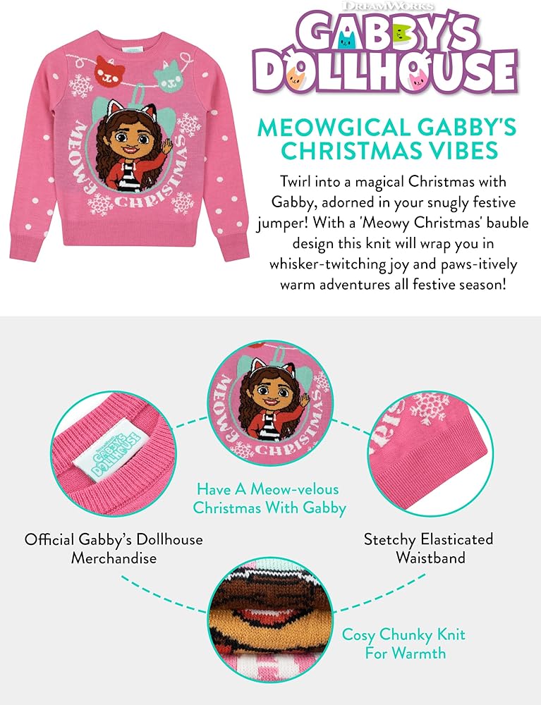 Comfort Meets Style In This Knitted Xmas Sweater: Meticulously crafted, this Gabbys Dollhouse sweatshirt assures a snug and gentle fit for your little ones throughout their festive adventures. Whether they're exploring their very own dollhouse or embarking on chilly winter escapades, this plush Christmas sweatshirt girls adore ensures they remain toasty and stylish.