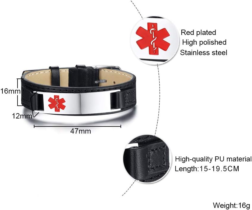 Adjustable Emergency ID Bracelets :Width 0.6"(16mm), Length can be adjusted from 5.9 inches-7.6 inches(150-195mm ),fit almost men's and women's size.