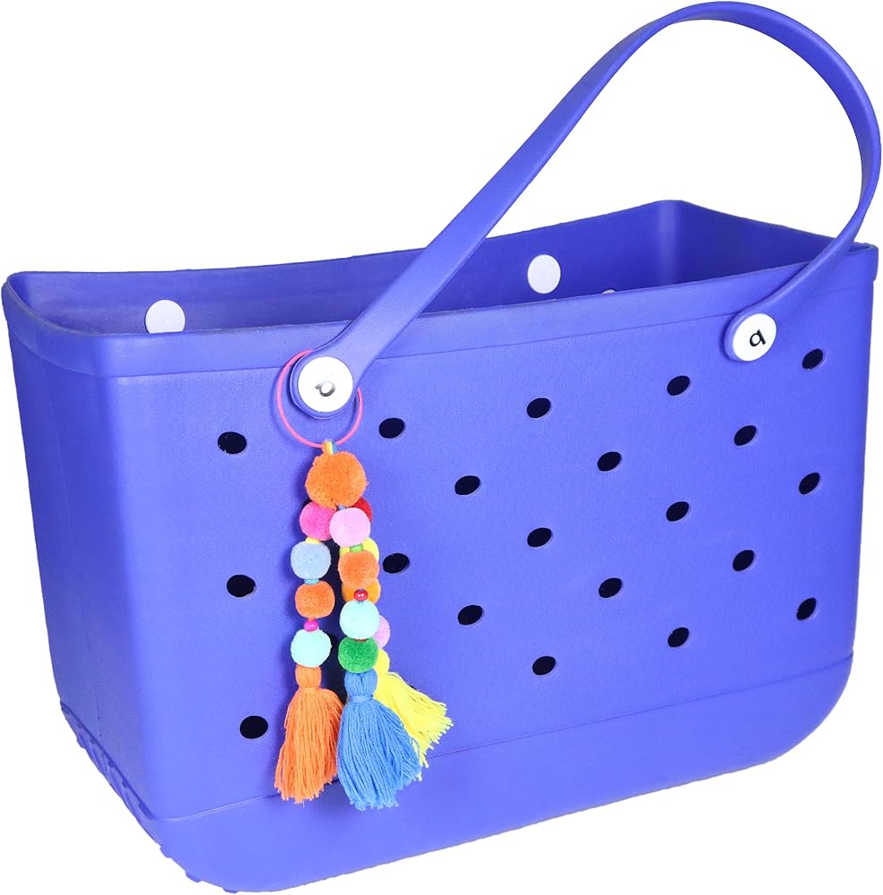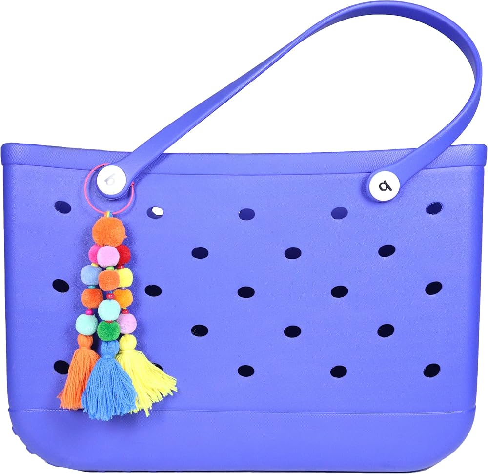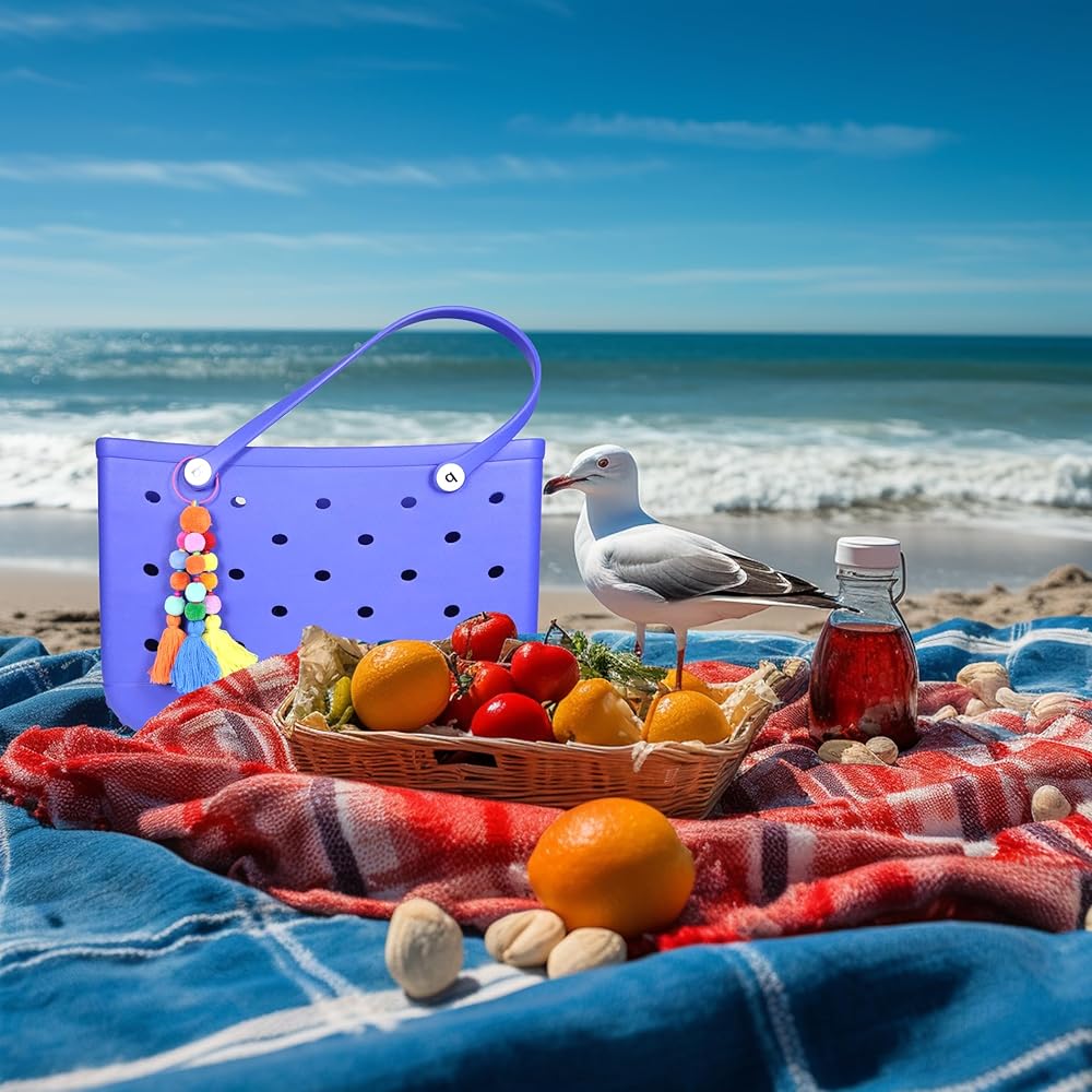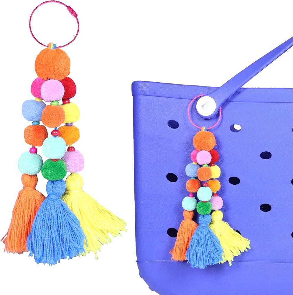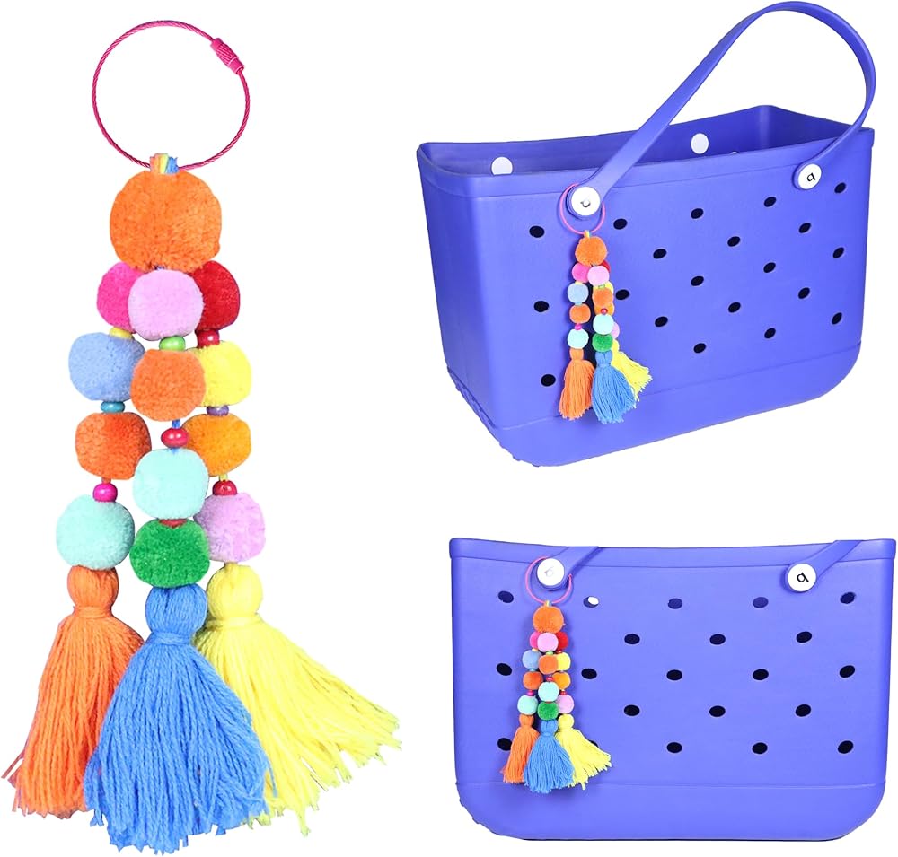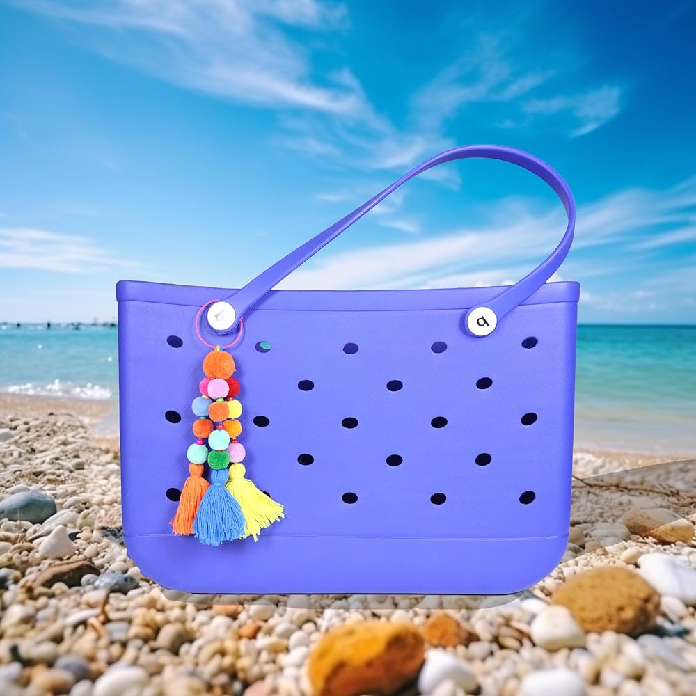Colorful Beach Accessory: Make your beach tote bag stand out with our vibrant pom poms and tassel charm accessories, designed to elevate your beach bag, The lively multicolored pom poms and tassels create a playful and eye-catching look for your rubber beach bag.