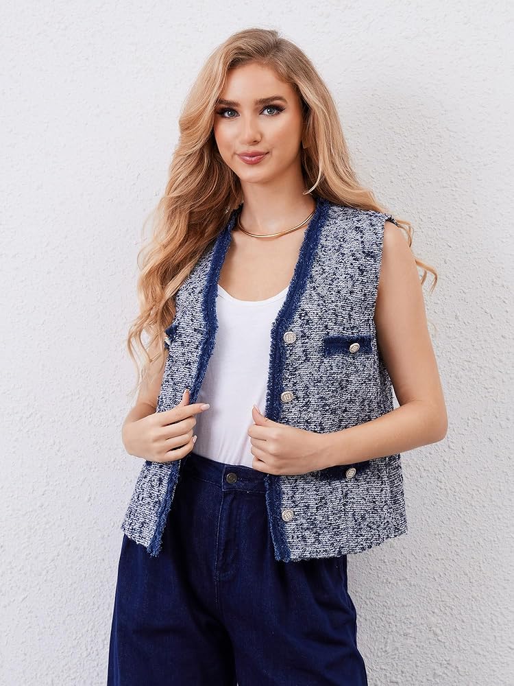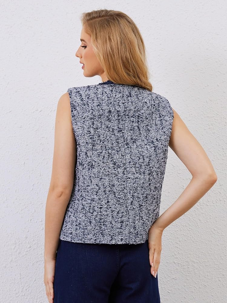 المزايا: قماش تويد، تصميم بدون ياقة على شكل حرف V، سترة بليزر بدون أكمام، إغلاق بأزرار سفلية، تصميم بحافة خام، بطانة كاملة. تقدم سترة التويد بدون أكمام أسلوبًا كلاسيكيًا أنيقًا لملابس العمل غير الرسمية للسيدات.