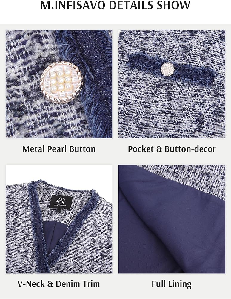 مطابقة: تتميز سترة التويد النسائية بتصميم كلاسيكي على شكل حرف H وزر للإغلاق. يمنحك فتحه من الأمام وإقرانه مع تنورة شعورًا بالاسترخاء، بينما يمنحه زراره وتنسيقه مع بنطال واسع الساق شعورًا رقيقًا.