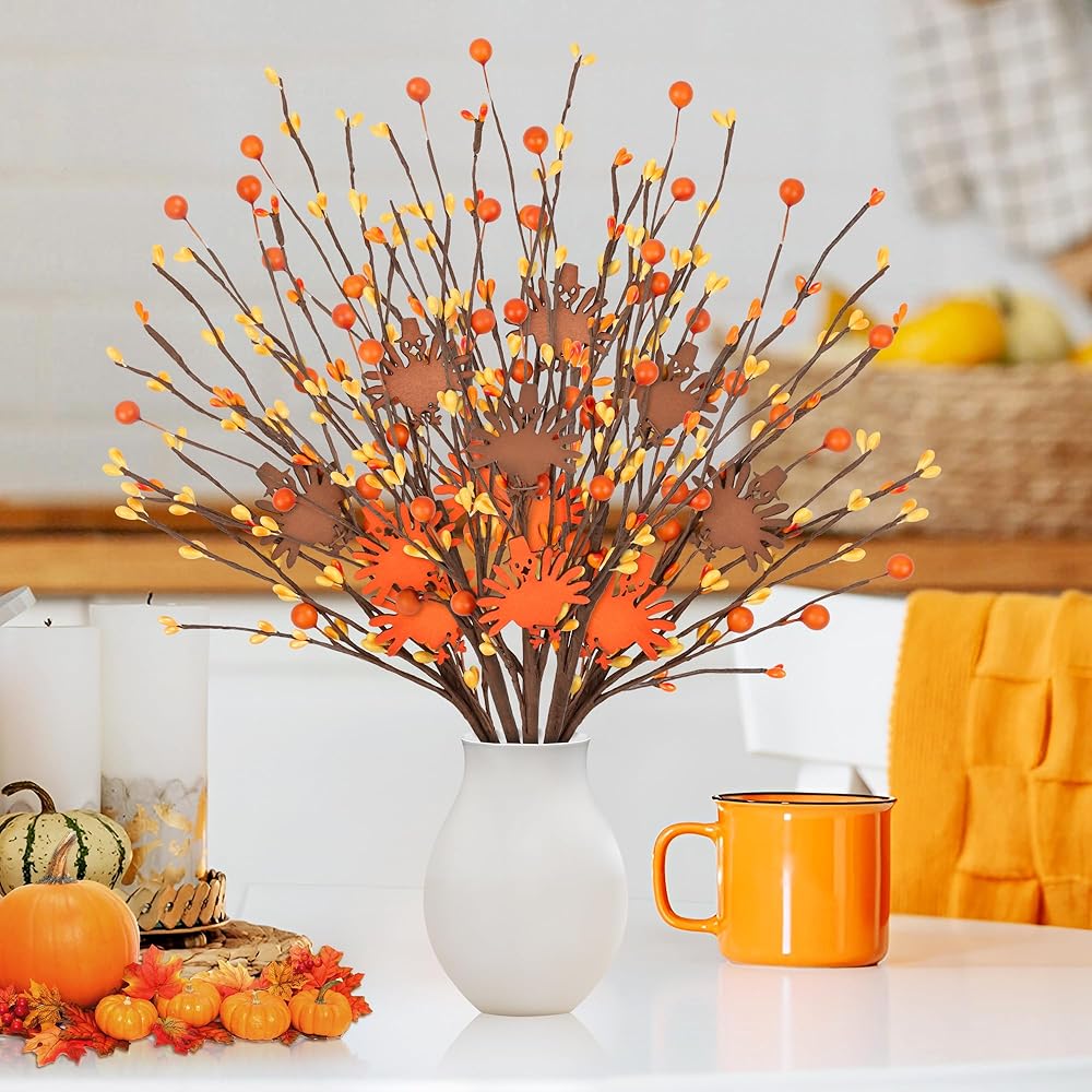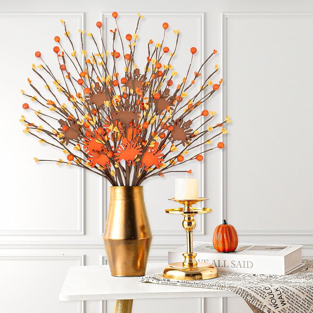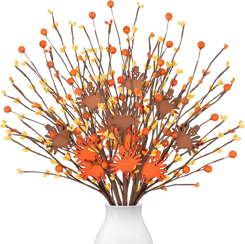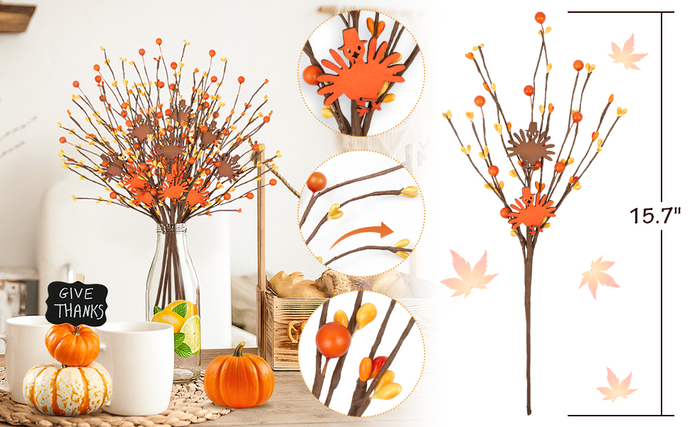 ديكورات عيد الشكر ديكور الطاولة سيقان التوت الاصطناعي، 6 عبوات عيد الشكر على شكل تركيا من اختيارات التوت البرتقالي لحشو المزهرية، لوازم هدايا الحفلات المركزية في المنزل وعيد الشكر