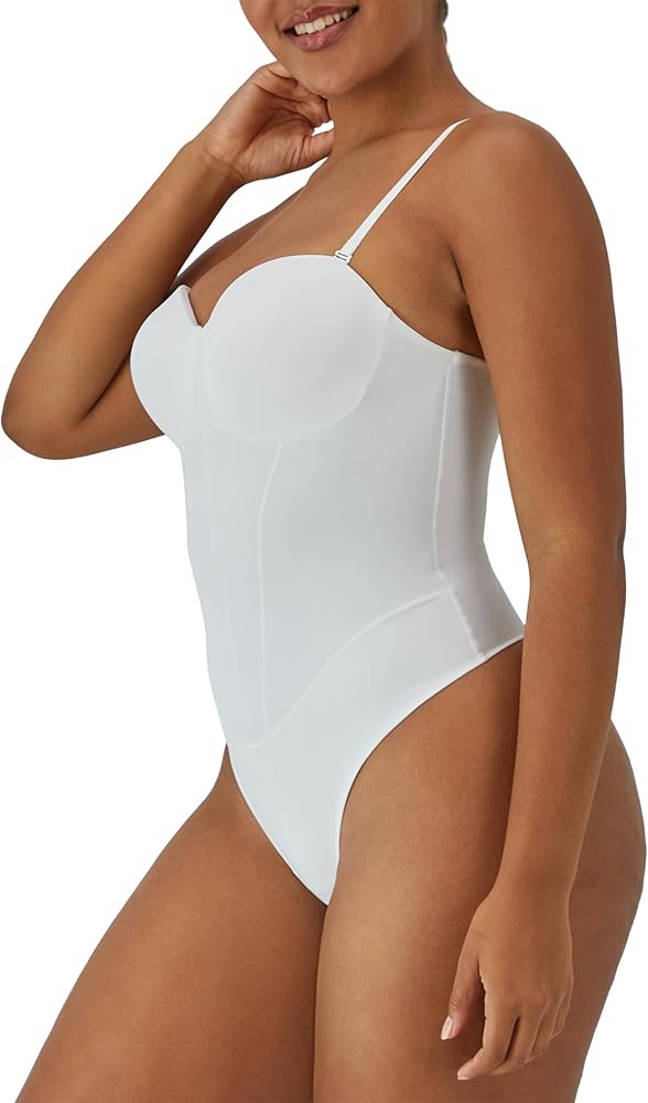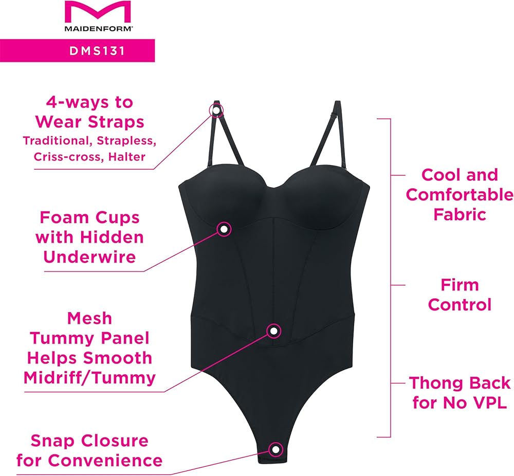 Sexy enough for a special occasion but comfy enough for every day. Let the Maidenform® Firm Control Tummy Shaping Multiway Thong Bodysuit shape you in the style and comfort you desire. Crafted from a lightweight fabric that is luxuriously soft and supportive, this firm control women's shapewear provides smoothing of your midsection. Faux corsetry lines help produce an hourglass appearance, while the foam cups and a hidden underwire offer stay-in-place support. You'll love the thong back that shows some cheek with no visible panty lines. Adjustable straps convert four ways, including strapless, for the ultimate in wardrobe versatility. The best part? It's so pretty you may not want to hide it under your clothes.
