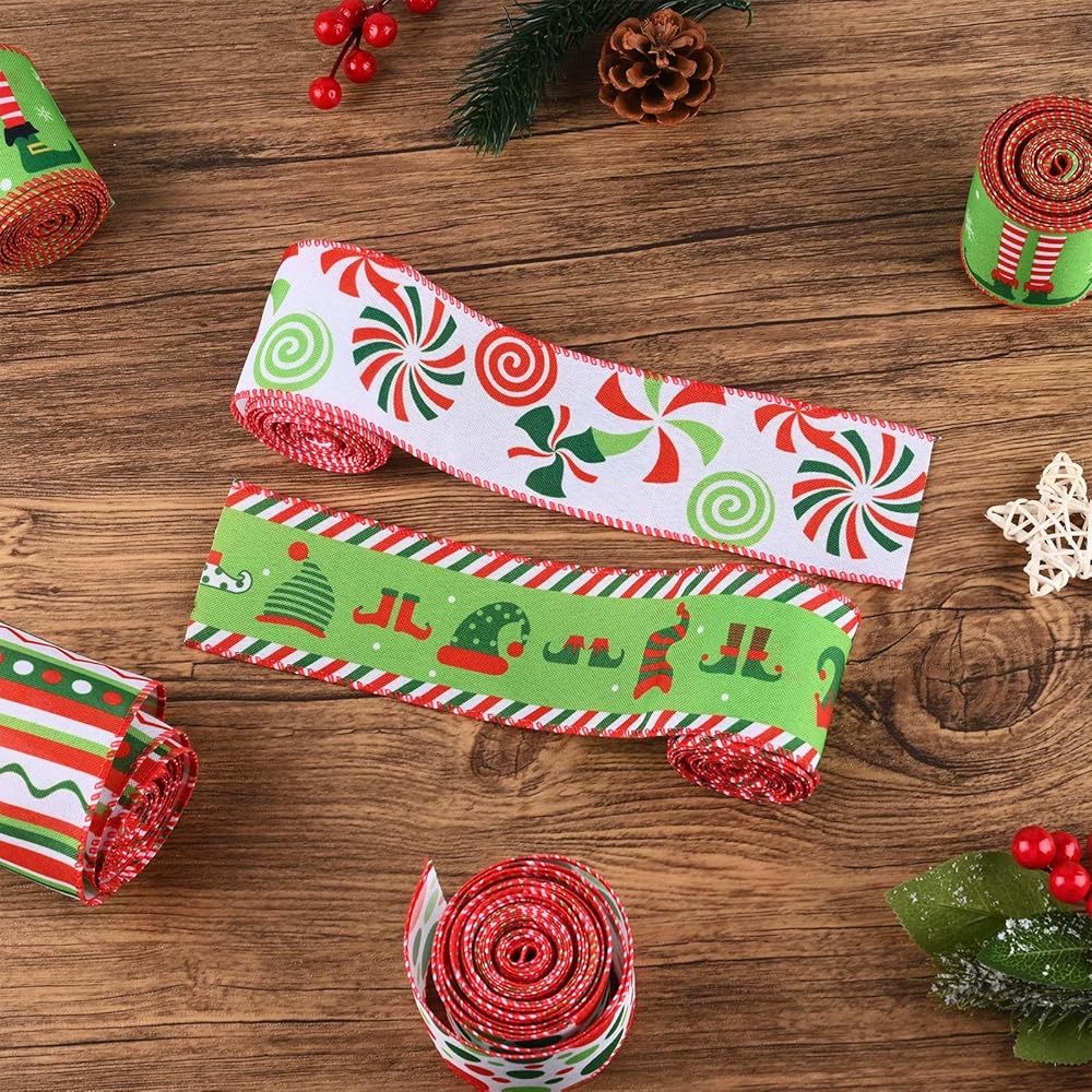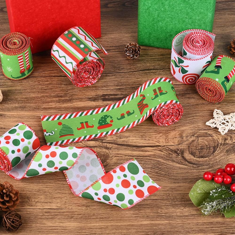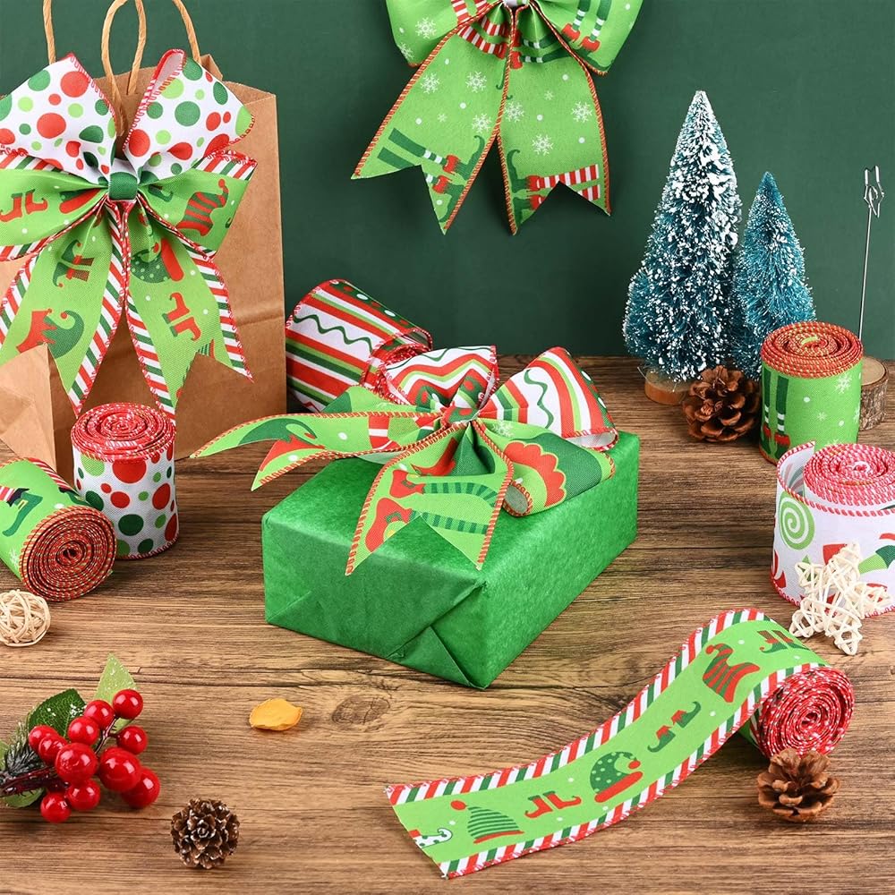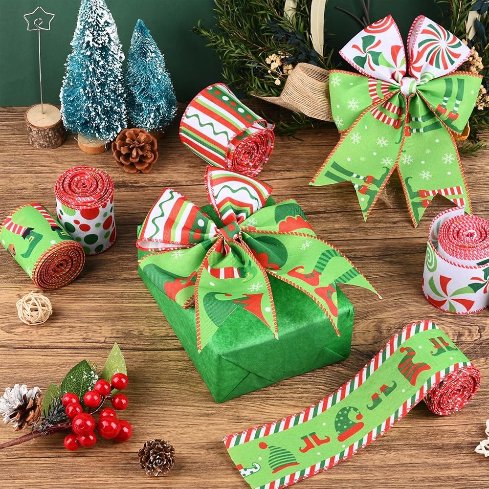 🎁🎄🎁【XMAS ELF DESIGN】: Our Christmas wired edge ribbon adopts green and red as theme colors, printed with adorable elf hats, elf socks, snowflakes, snow dots, multicolored dots, stripes, loopy candies, etc., which is associated with bringing good luck and spreading happiness, suitable for making beautiful bows for your presents.