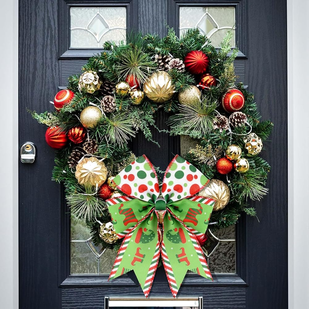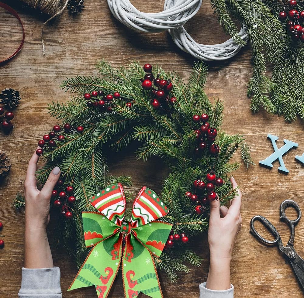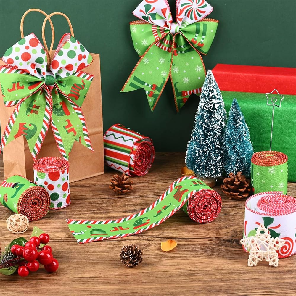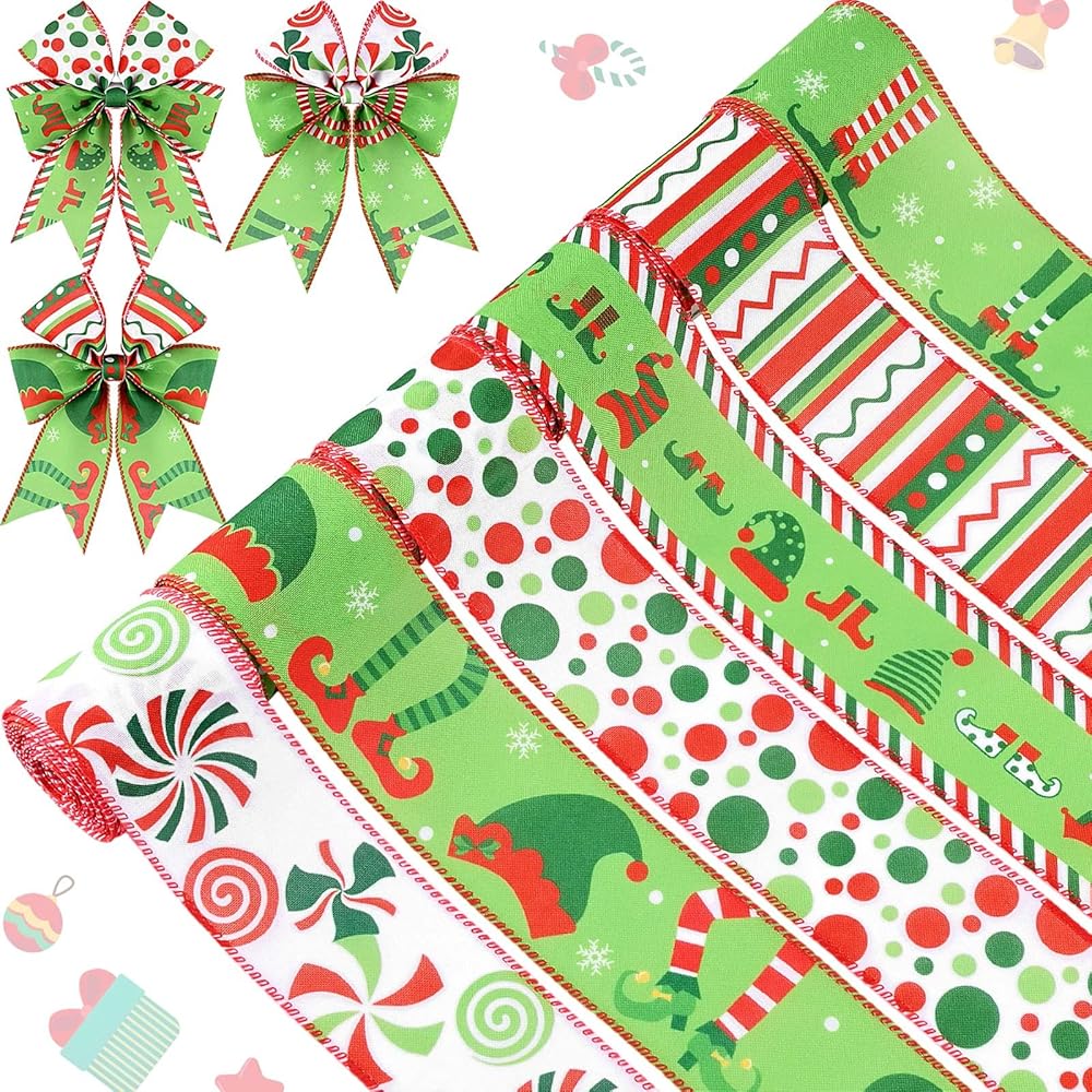 🎁🎄🎁【XMAS ELF DESIGN】: Our Christmas wired edge ribbon adopts green and red as theme colors, printed with adorable elf hats, elf socks, snowflakes, snow dots, multicolored dots, stripes, loopy candies, etc., which is associated with bringing good luck and spreading happiness, suitable for making beautiful bows for your presents.