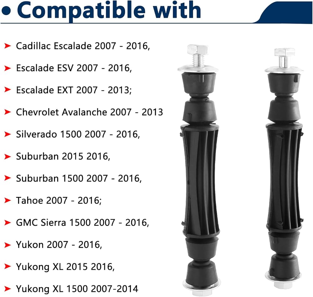 مناسب: K700432 وصلات طرفية لقضيب التثبيت الأمامي متوافقة مع Escalade 2007 - 2016، Escalade ESV 2007 - 2016، Escalade EXT 2007 - 2013؛ شيفروليه أفالانش 2007 - 2013 سيلفرادو 1500 2007 - 2016، سوبربان 2015 2016، سوبربان 1500 2007 - 2016، تاهو 2007 - 2016؛ جي إم سي سييرا 1500 2007 - 2016، يوكون 2007 - 2016، يوكونغ XL 20 15 2016، يوكونغ XL 1500 2007-2014
