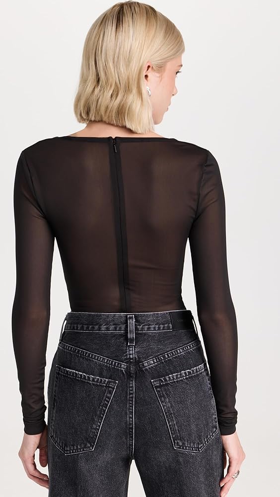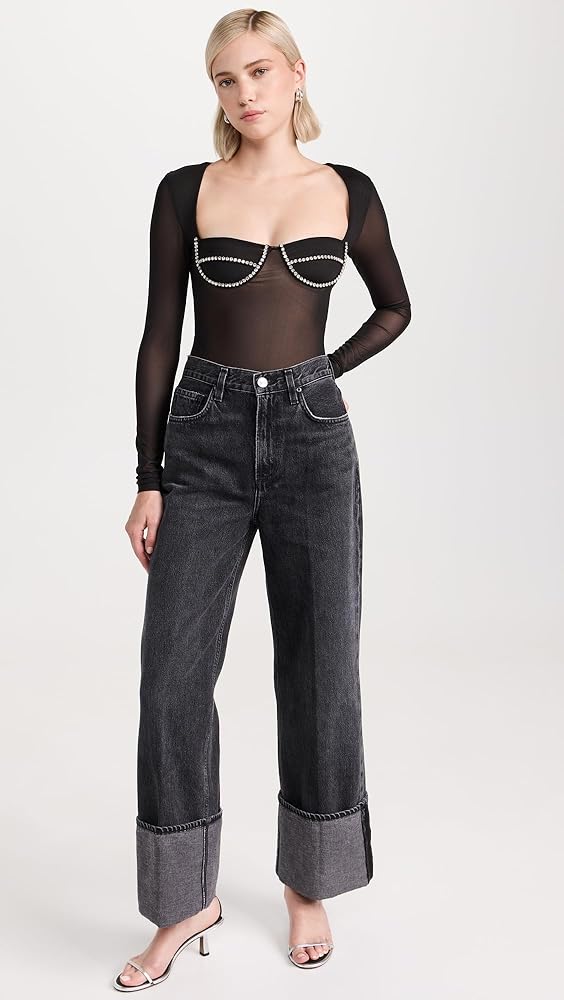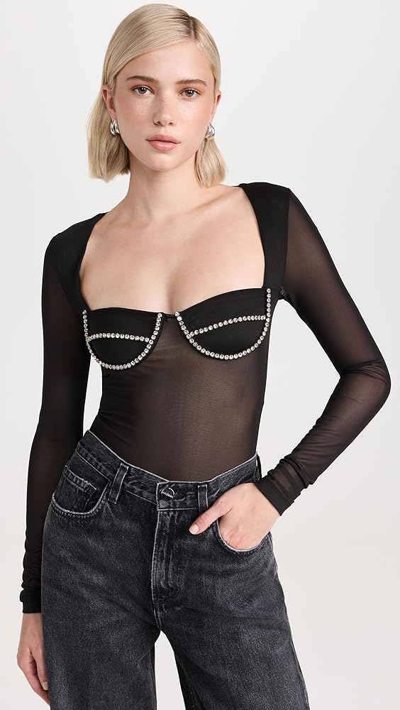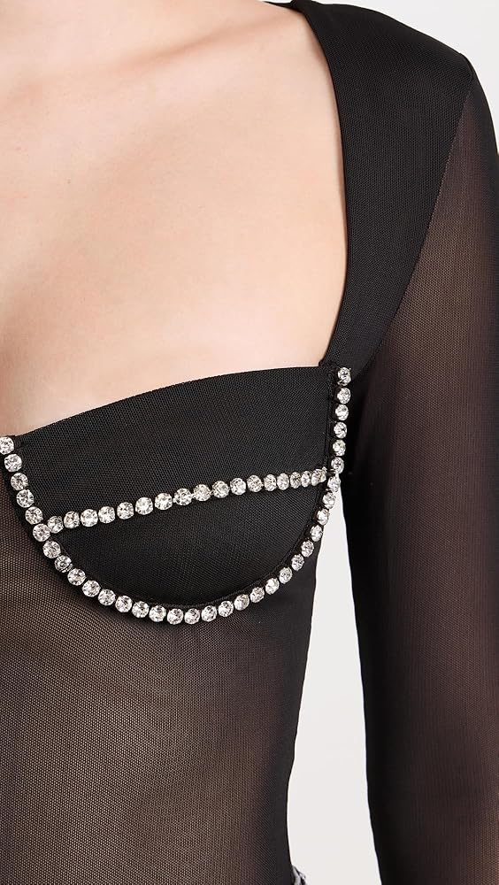 - لباس داخلي ثونغ مزود بوصلة كبس، وأكواب داخلية مزينة بالكريستال، وخط عنق مربع وأكمام طويلة