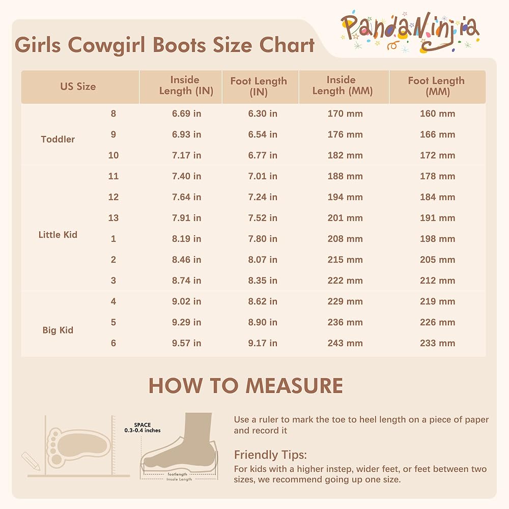 • How to Choose Girls Western Boots Size: In order to get the most suitable kids riding shoes, we recommend that you carefully measure your girls' length of feet before ordering, and combine the detailed size table provided to choose
