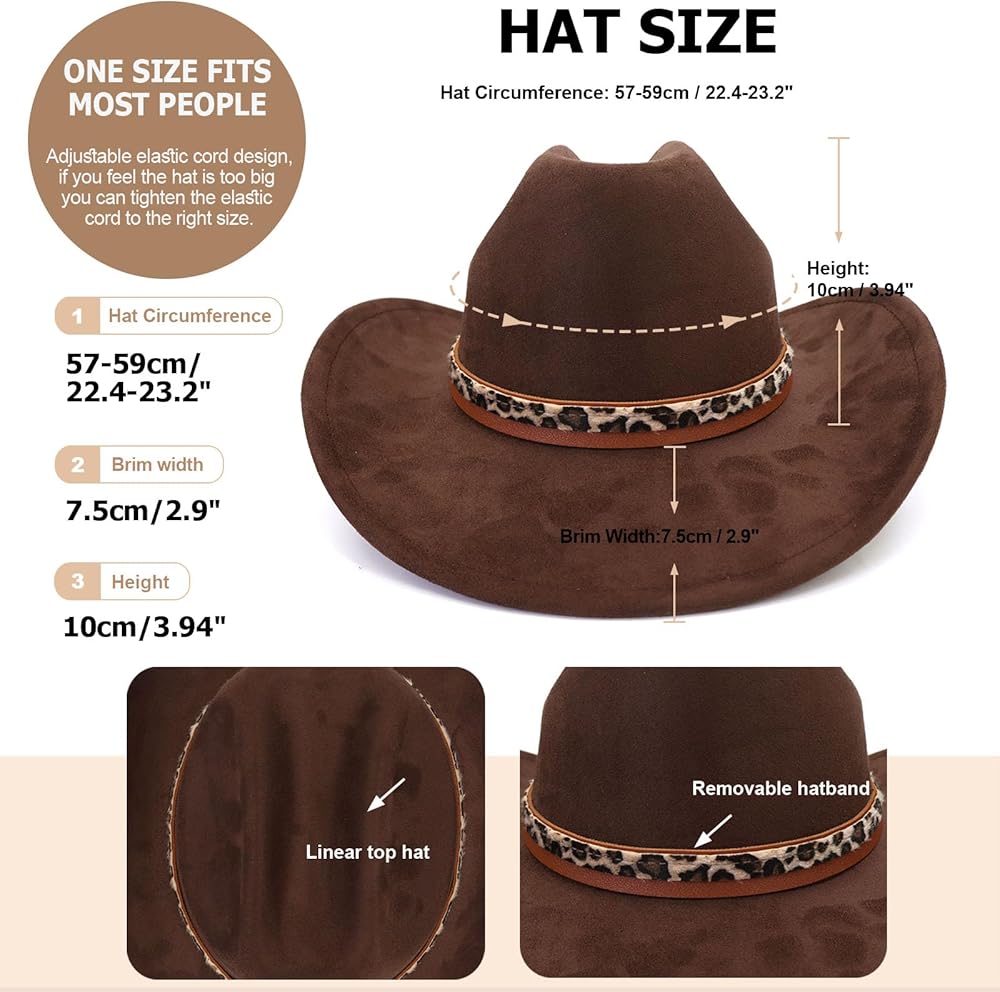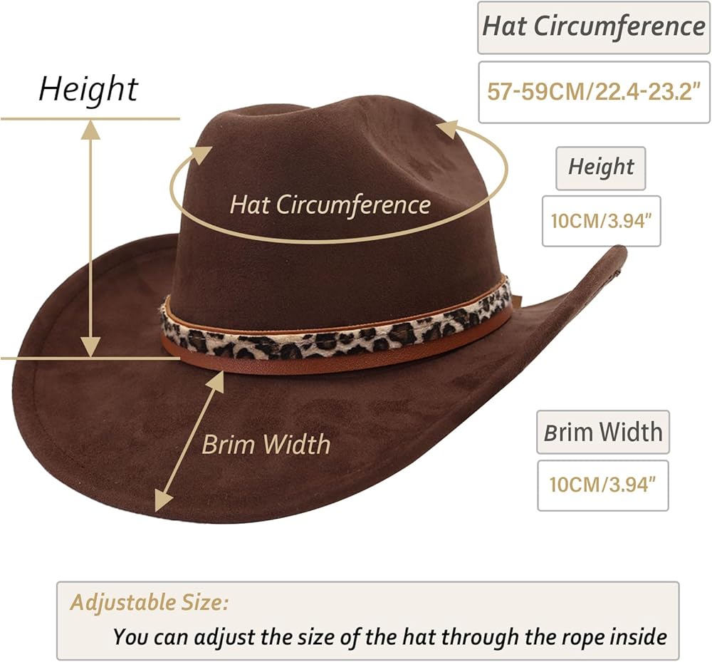 مقاس قابل للتعديل: محيط قبعة رعاة البقر من الجلد السويدي: 57-59 سم/22.4-23.2 بوصة، عرض الحافة: 7.5 سم/2.9 بوصة، ارتفاع قبعة رعاة البقر 10 سم/3.94 بوصة، يوجد حزام بمقاس قابل للتعديل، إذا شعرت أن المقاس غير مناسب، يمكنك التعديل حسب محيط رأسك!