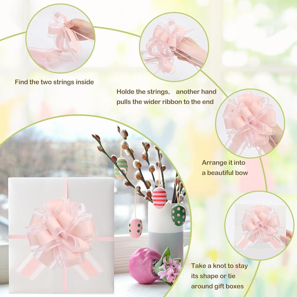 استخدام واسع: أقواس الهدايا هي طريقة مثالية لتغليف الهدايا أو تزيين سلال الهدايا الخاصة بك، وصناديق الهدايا، وحقائب الهدايا، والحفلات، والجدار المنزلي، وممر حفل الزفاف، والكنيسة، والبيو، والسيارة، وأقواس السحب لتغليف الهدايا، وأقواس السحب لسلال الهدايا. وأماكن مختلفة