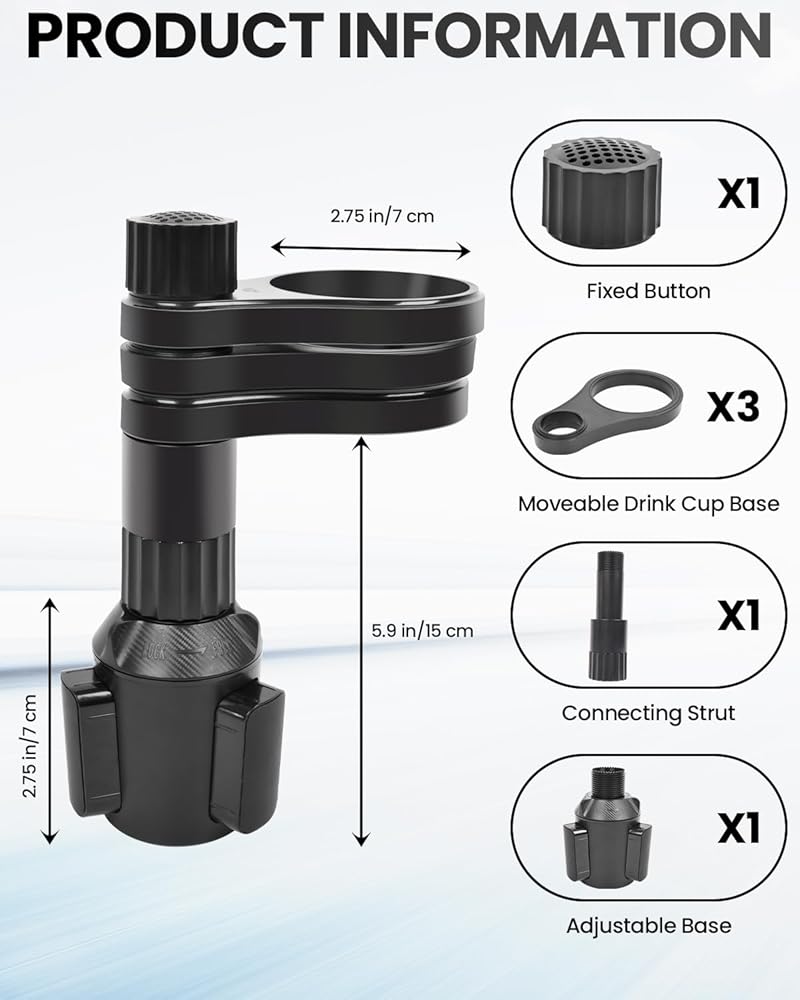 موسع حامل الأكواب: يتميز موسع حامل الأكواب المبتكر هذا بقطر 7 سم/2.75 بوصة وهو مجهز بـ 3 حوامل مشروبات قابلة للتعديل. يتسع بشكل مريح لما يصل إلى 3 أكواب أو زجاجات في وقت واحد، مما يجعله مثاليًا للرحلات العائلية أو النزهات مع الأصدقاء. استمتع براحة تناول مشروبات الجميع في متناول اليد أثناء السفر معًا