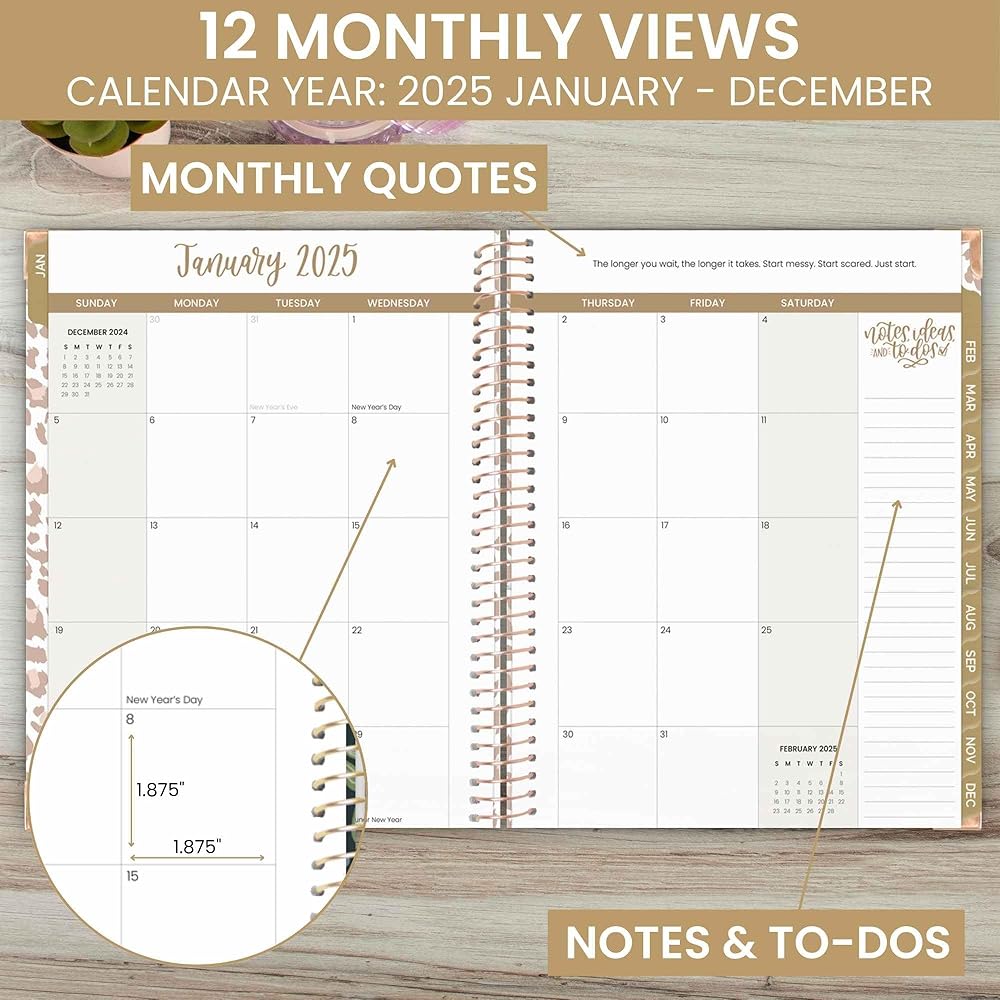 الأبعاد والتصميم: 8.5 بوصة عرض × 11 بوصة طول. تتوفر أيضًا خيارات مخطط أصغر! نظرة عامة شهرية مكونة من صفحتين وعروض أسبوعية واسعة تمتد على مدار السنة التقويمية، يناير 2025 حتى ديسمبر 2025 - 365 يومًا من التخطيط! تكون المشاهدات الأسبوعية أفقية وتتضمن تتبع الأولويات والعادة