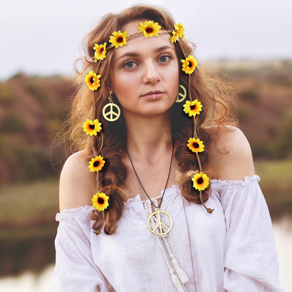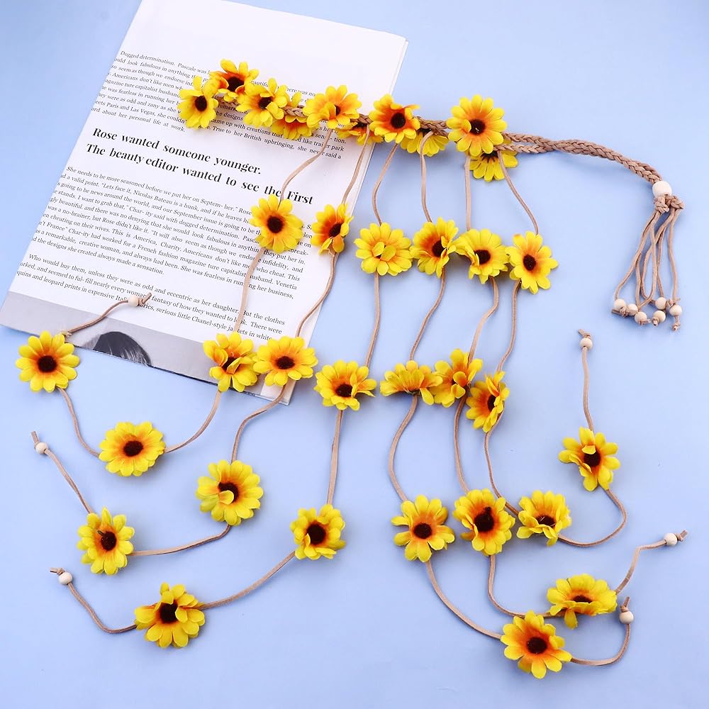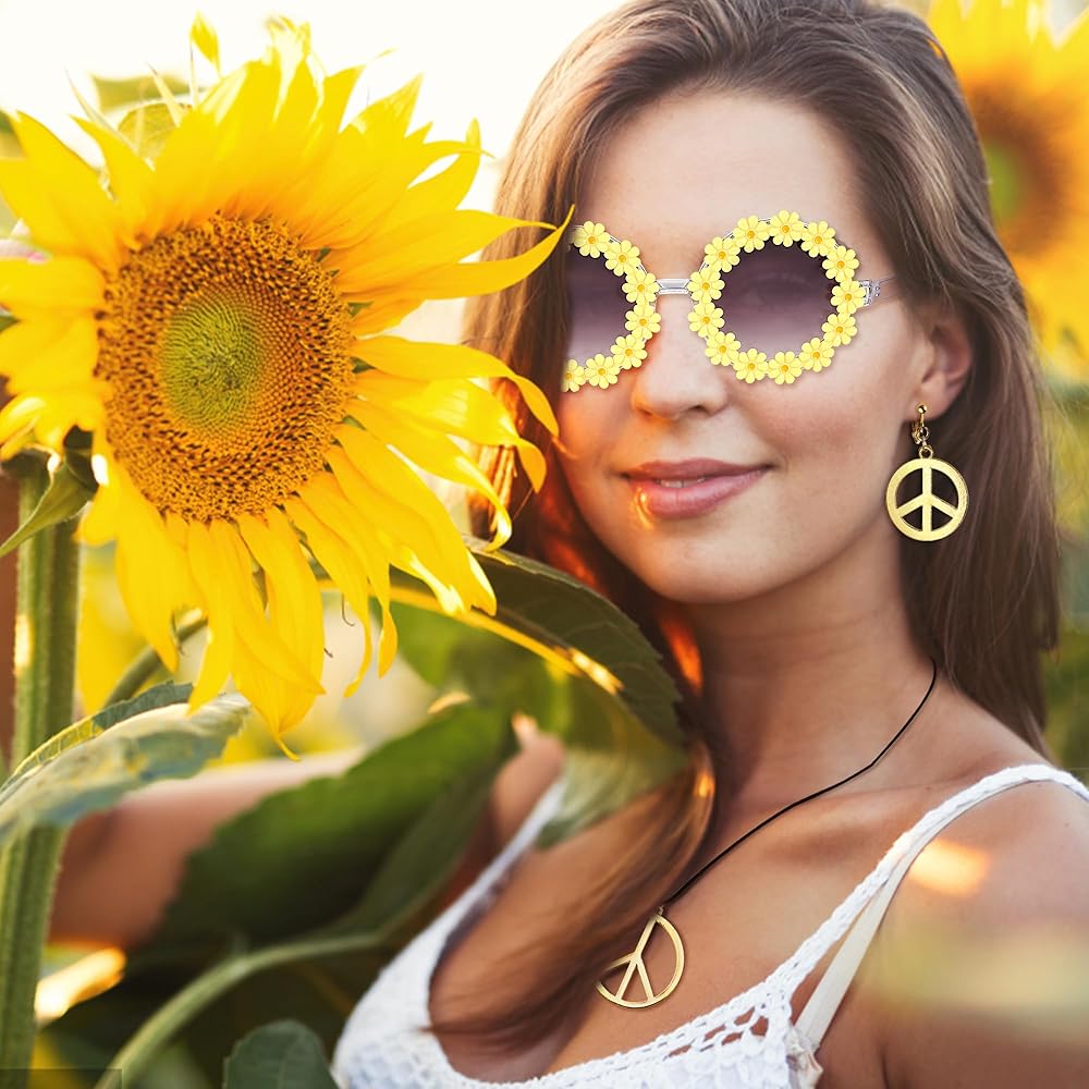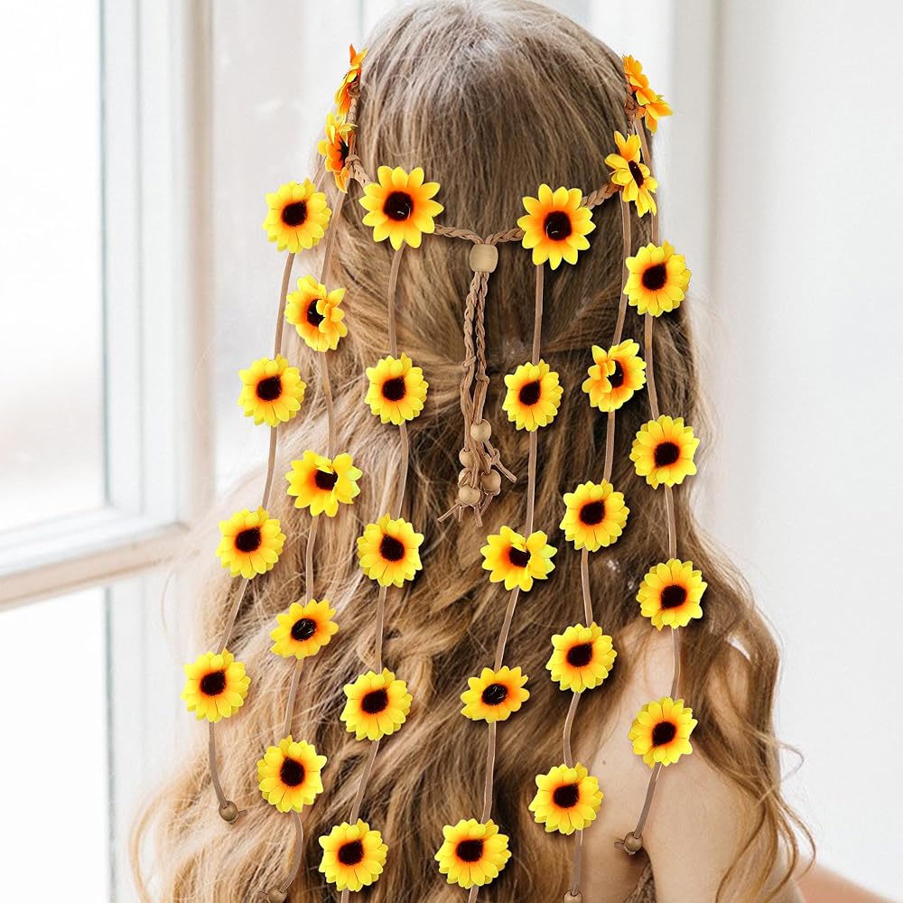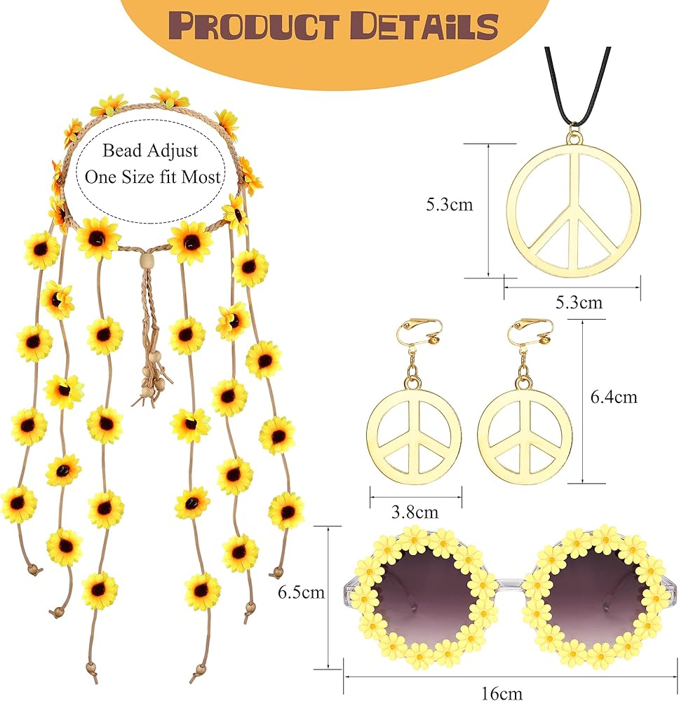 تصميم إكسسوارات هيبي: نظارات شمسية من السبعينيات وإكسسوارات شعر السبعينيات للنساء تتكون من عباد الشمس، تستخدم كورولا حبلًا مضفرًا وخرزًا، تحاكي موضة العصر مما يجعلها إكسسوارًا للأزياء. مما سيجعلك تبدين أكثر أناقة عند استخدامه كزينة للشعر. مجموعة هيبي متعددة الألوان، الألوان الزاهية تجعلك أكثر سحرًا