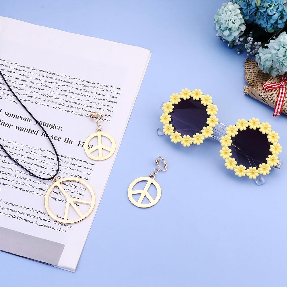 إكسسوارات هيبي للنساء: سوف تحصل على قطعة واحدة من عصابات رأس هيبي للنساء، قطعة واحدة من نظارات هيبي، قطعة واحدة من قلادة علامة السلام وزوج واحد من أقراط علامة السلام، ملونة وعتيقة، تظهر طراز الستينيات أو السبعينيات وتجعلك مركز الاهتمام في حزب