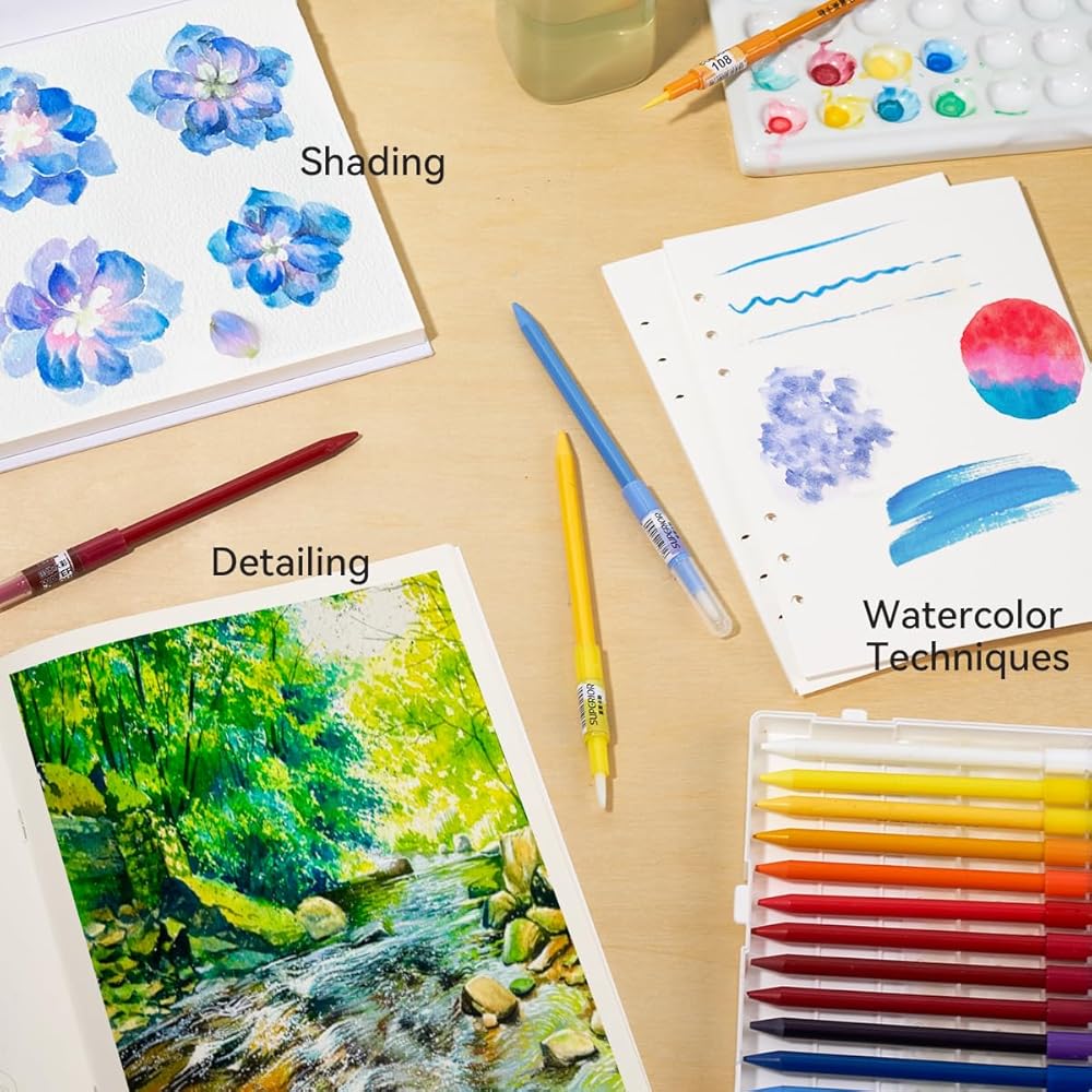 • طلاء وفرشاة 2 في 1 - يأتي كل قلم ألوان مائية مزودًا بفرشاة مدمجة، مما يسمح لك بوضع اللون مباشرة من الأنبوب دون الحاجة إلى أدوات إضافية. يوفر هذا التصميم المبتكر المساحة ويجعل الرسم أكثر ملاءمة، خاصة للرسم في الهواء الطلق أو أثناء السفر.