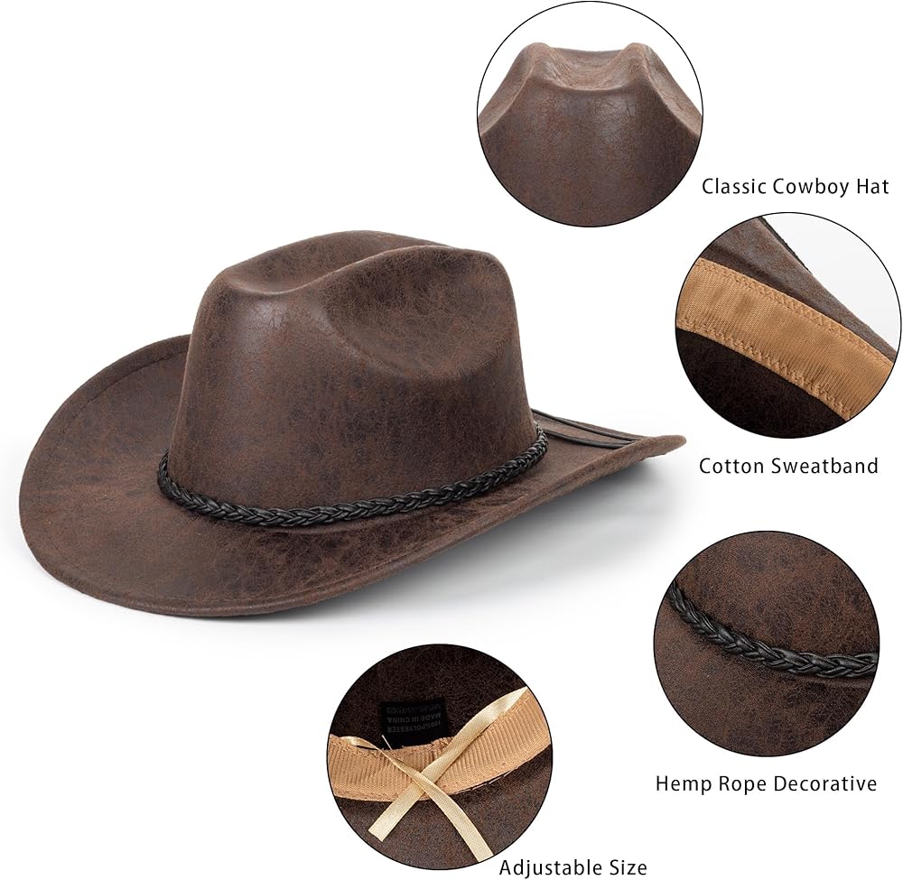 Our Western Cowboy Hat Made from PU leather,adjustable strip inside,you can adjust hat size,Classic Western Cowboy Hat is also very suitable as a deco or gift for parties, masquerade, Christmas, Halloween, etc