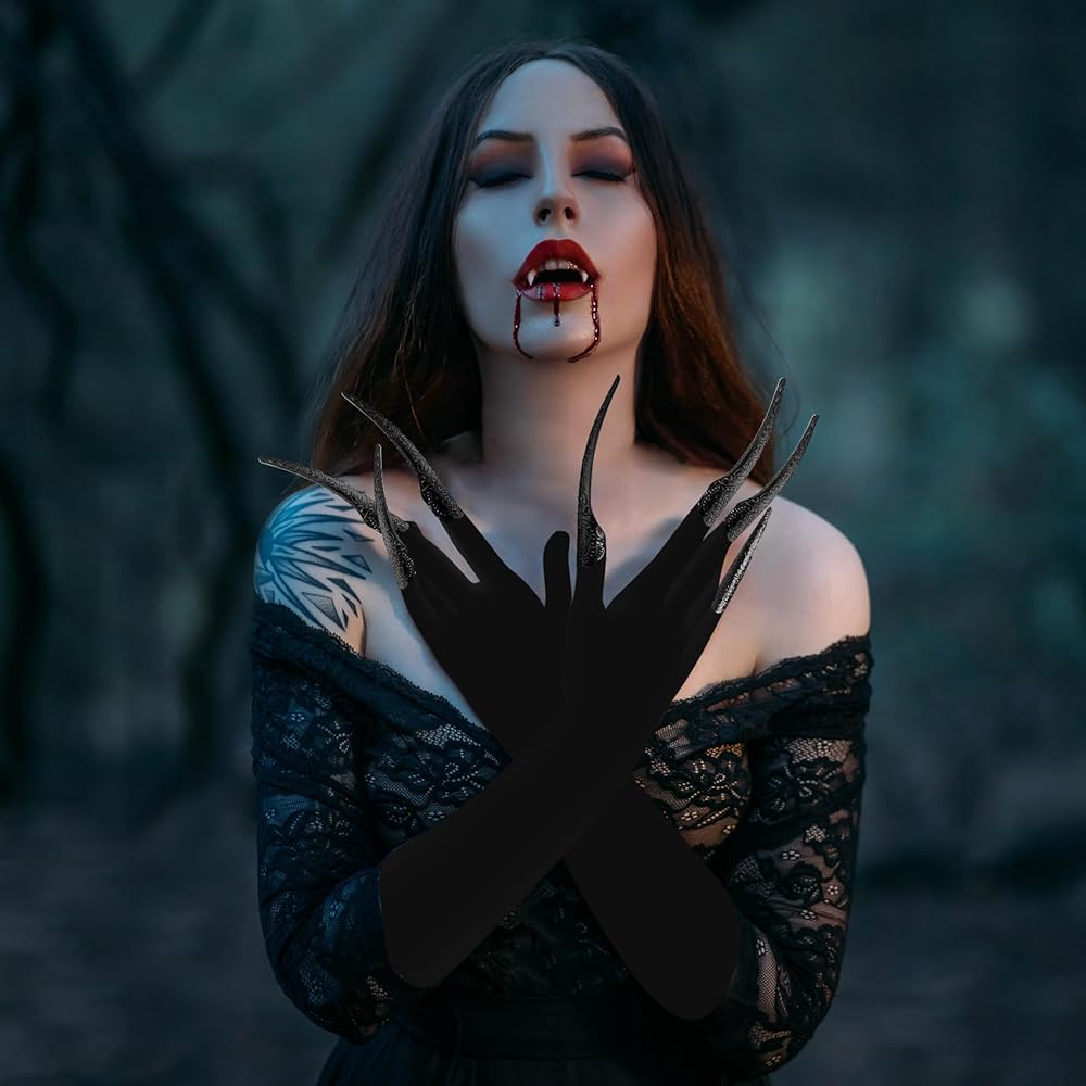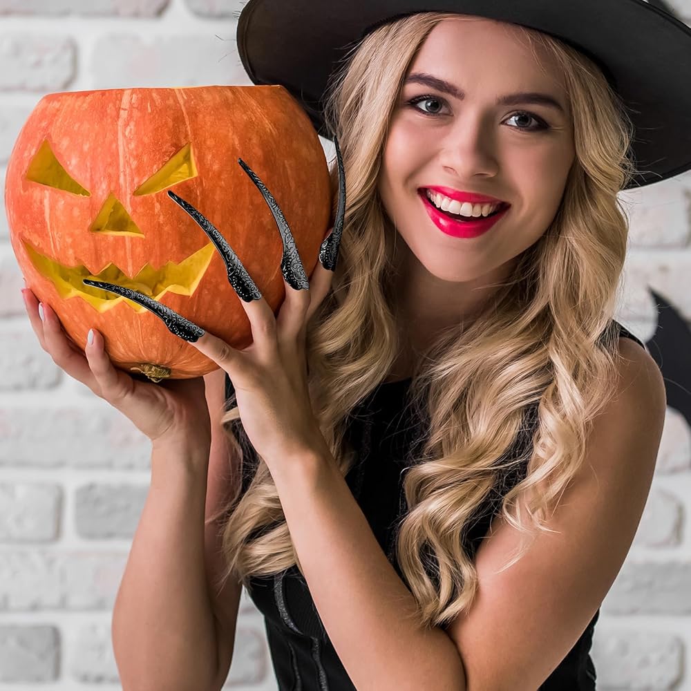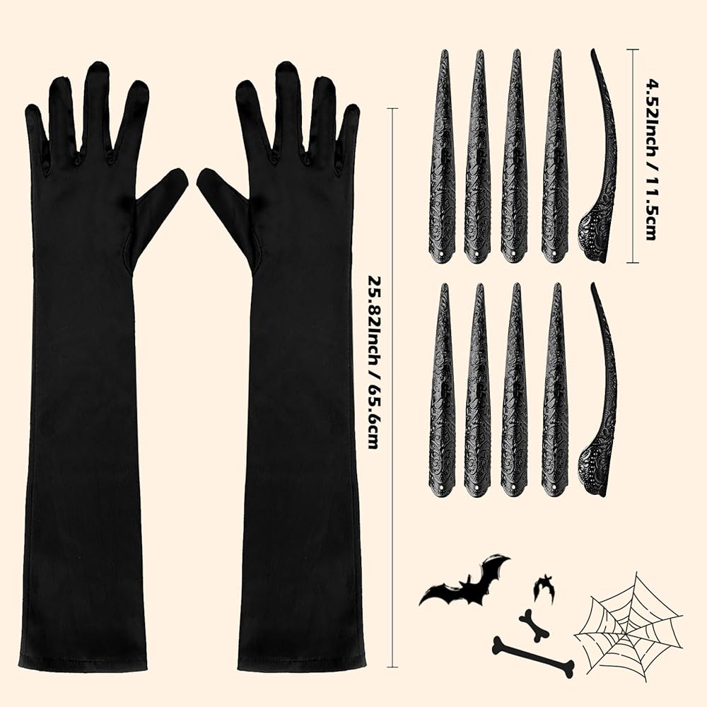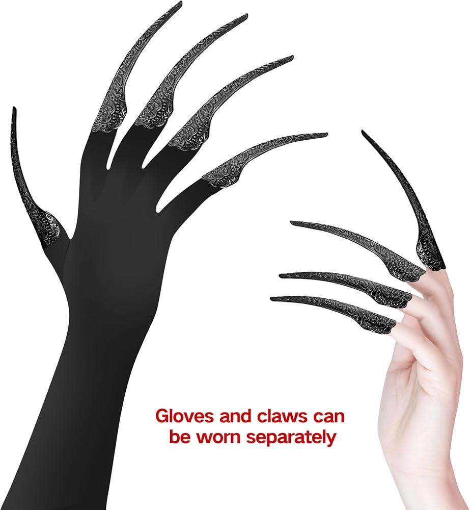 Package Included: You will get 10 Pack Black Finger Nail Tip Claw Rings and 1Pair Black Paw Gloves.